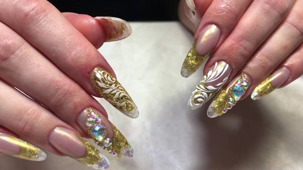 При помощи сверкающих деталей специалисты могут даже изменить форму ногтевой пластины, расставив акценты в нужных местах.