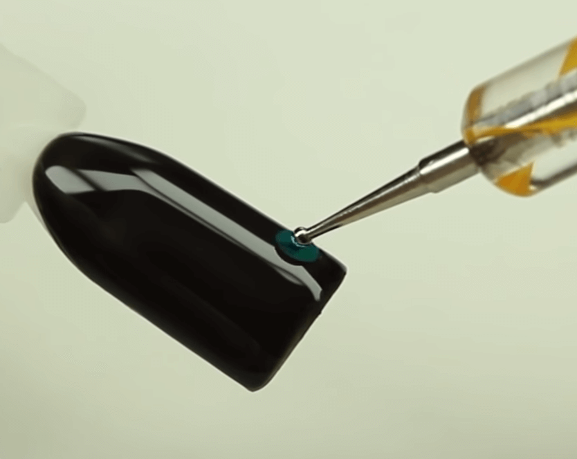 - Теперь можно приступать непосредственно к созданию самого объема. Для этого необходимо взять тонкую кисть и набрать на нее небольшое количество геля, круговыми движениями наносится капля, которая должна быть по форме такая же, как и камифубуки на ногте. После того как вы равномерно распределите гель, необходимо опустить ноготки вниз, для того чтобы капля вытянулась и стала круглой.