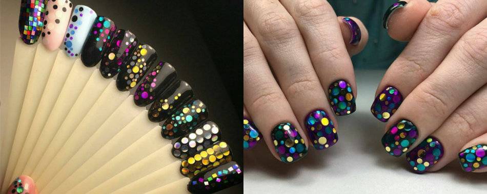 Это – одна из легчайших и самых эффективных техник, используемых для декорирования ногтей. Традиционный набор состоит из нескольких типов конфетти. В комплекте 3 разных размера и 3 разных цвета. Обычно, конфетти бывает круглой формы. Сейчас можно в продаже увидеть конфетти, в форме: