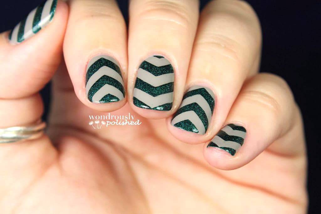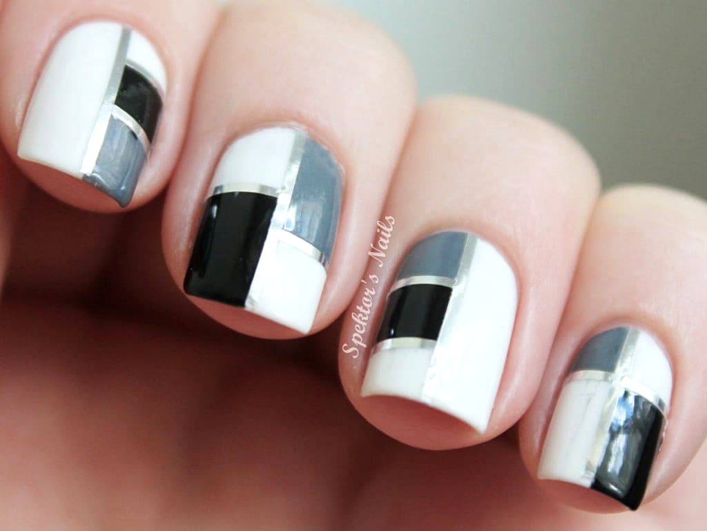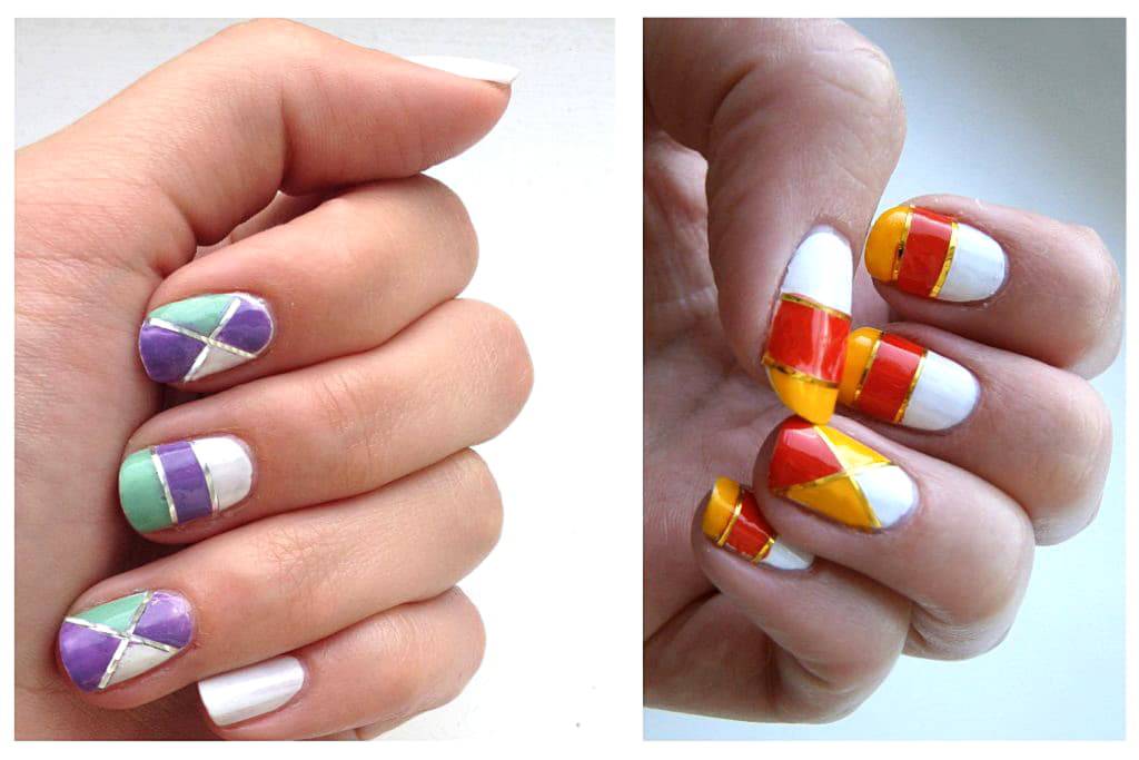 Геометрический узор на ногтях можно легко сделать, используя клеющиеся ленты. Их легко заменить обычным канцелярским скотчем. Самый легкий маникюр, сделанный таким методом – всевозможные полоски и блоки на ногтях. Для начала ногтевая пластина покрывается базовым лаком. После его высыхания, сверху наклеиваются кусочки скотча, а не заклеенная часть выкрашивается другим лаком. Так можно сделать двухцветный маникюр.