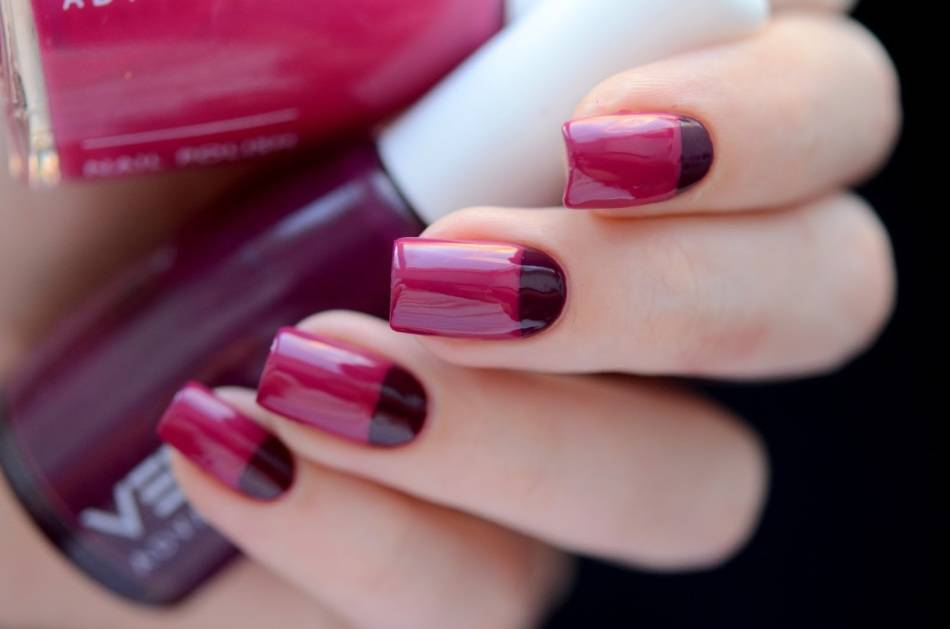 При использовании темных тонов лучше не закрашивать весь ноготь. Если по бокам оставить несколько миллиметров, то визуально палец будет казаться изящным и вытянутым.