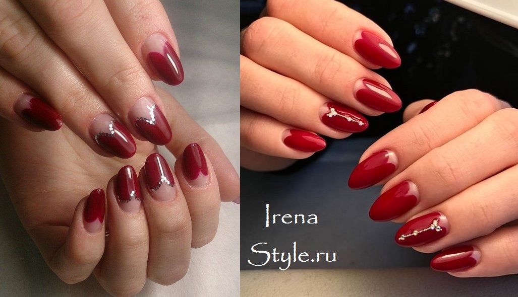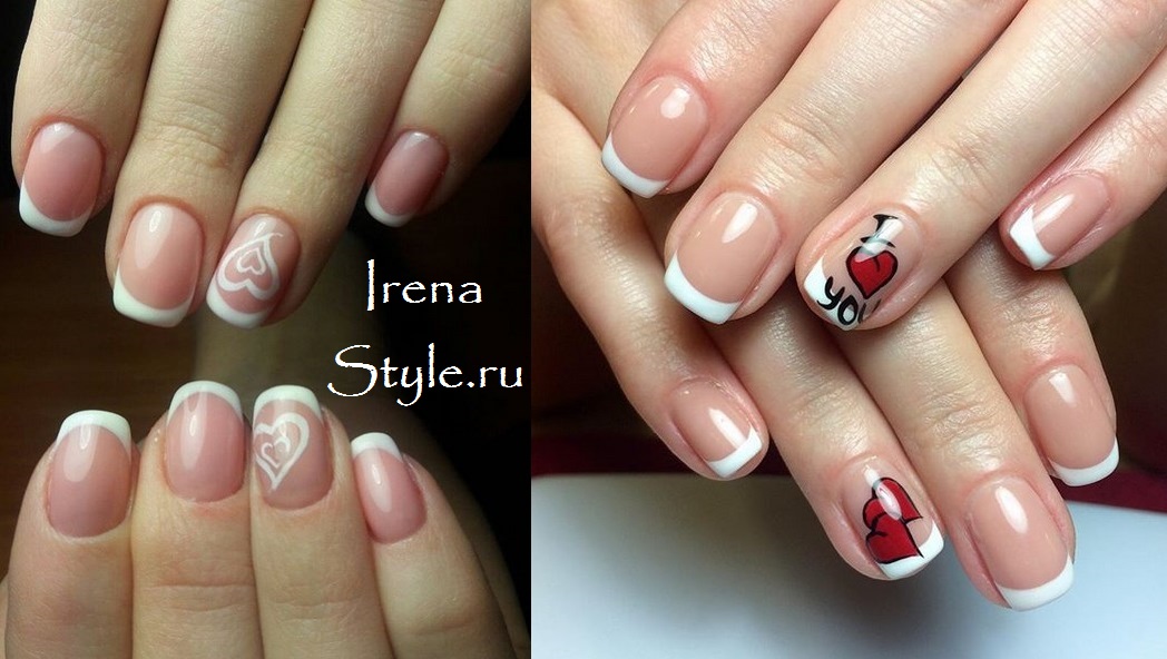 Френч похож на лунный маникюр по исполнению, только тут выделяется контрастным цветом зона улыбки. При этом интересный вариант оформления — это линия сердец на кончике ногтя. А можно сделать классический французский маникюр, но безымянный пальчик украсить обилием красных сердец.