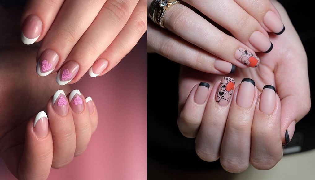 Для любителей френча можно сочетать французский маникюр с изображением сердец. В этом варианте дизайна ногтей можно сочетать несколько техник. Выполнять френч на отдельных ногтях, а остальные украшать блестками или рисунками.