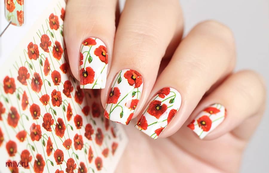 - с единичными изображениями – цветами, сердцами, животными, для фрагментного оформления ногтя;