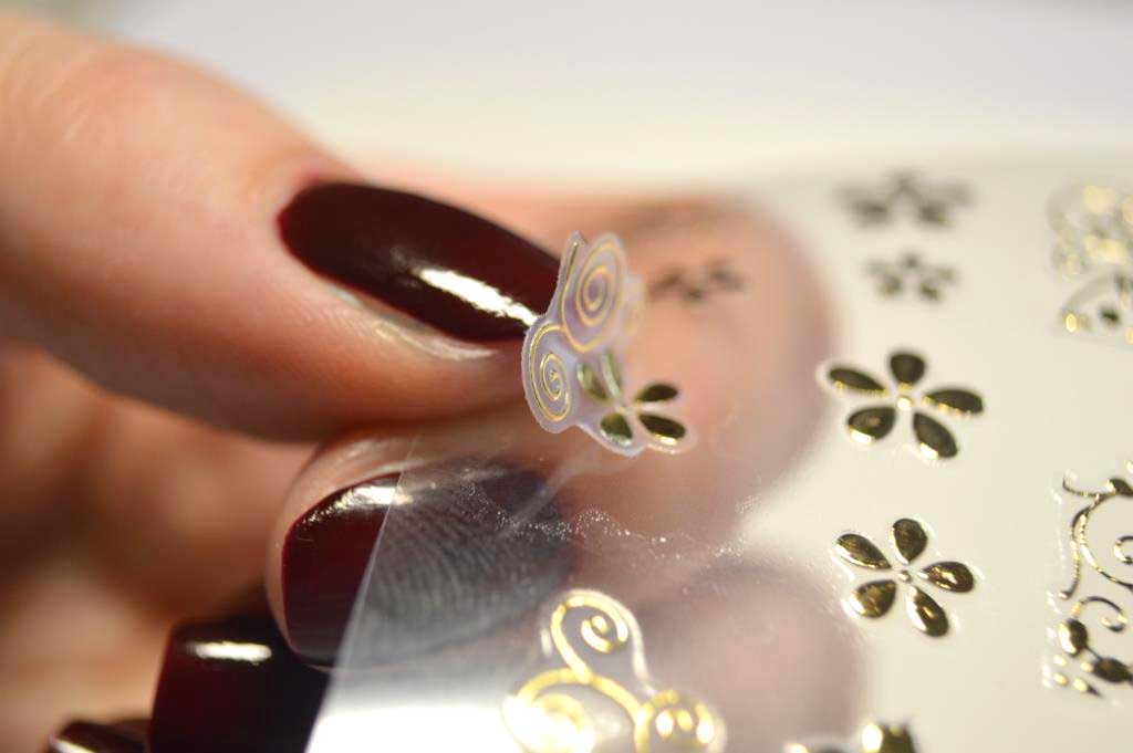 Отделить наклейку от основы и осторожно приклеить на ноготь. Разгладить складки с помощью бамбуковой палочки