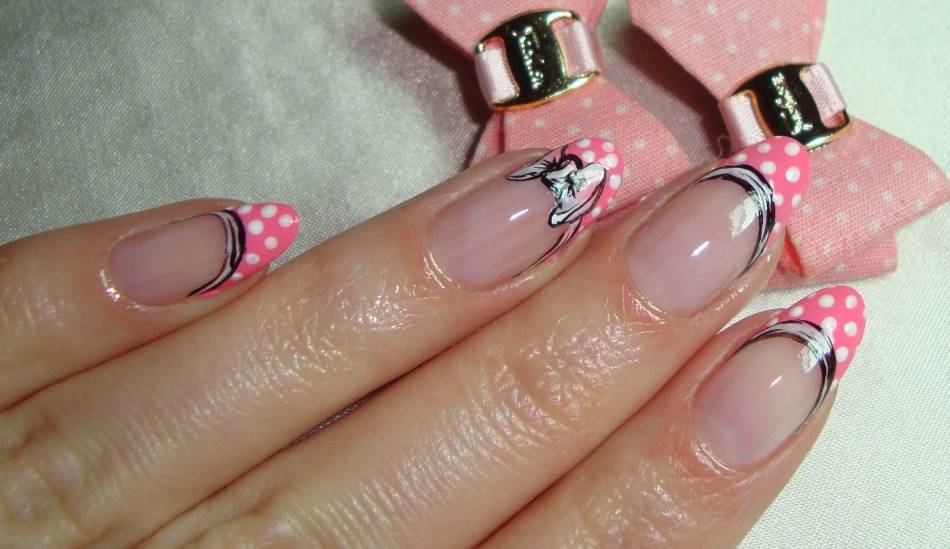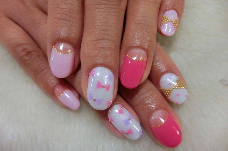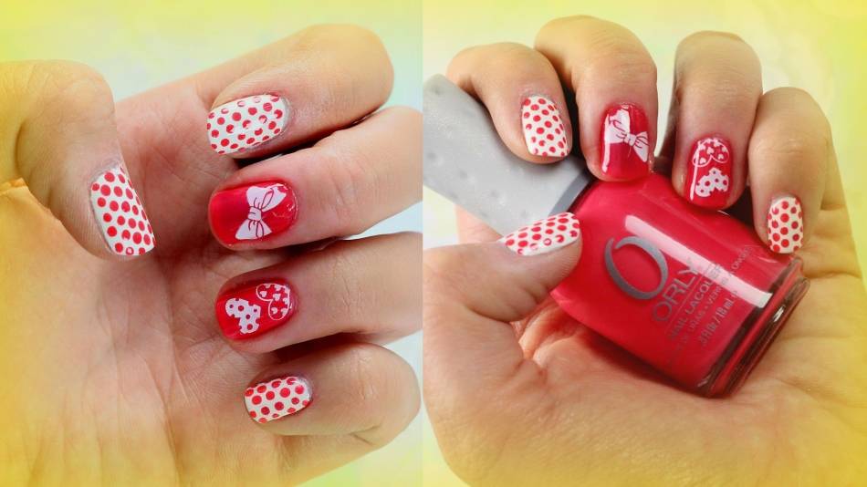 - Горох или бантики на нескольких ногтях. В этом случае бантики и точки вырисовываются на разных пальцах