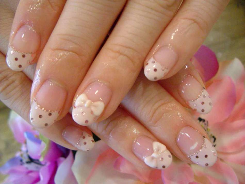 - Френч с горохом и бантиком. В таком случае бантик вырисовывается непосредственно по линии улыбки. По всей площади свободного края наносятся кружки одного размера и цвета