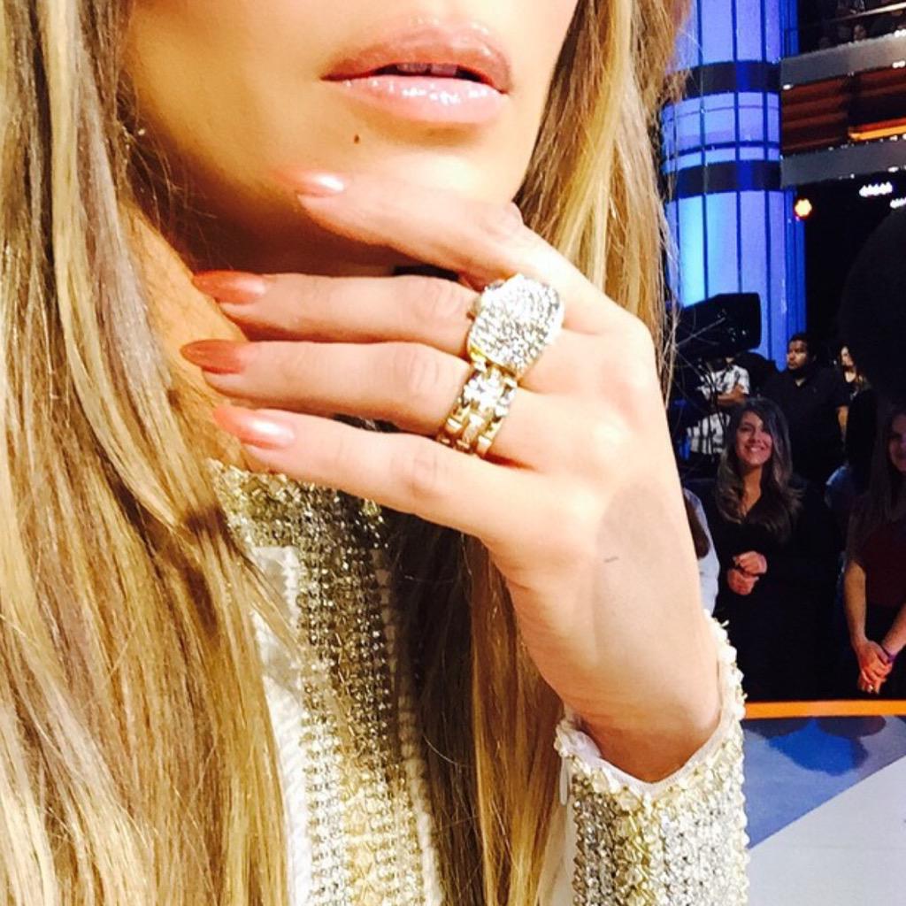 Этот простой, нежный в золотисто-бежевых тонах Дженни выбирает для повседневной жизни – например, милых посиделок за чашечкой кофе. На указательных пальцах – цифры 2 и 24: наверное, они связаны с каким-то значимым событием в жизни звезды.