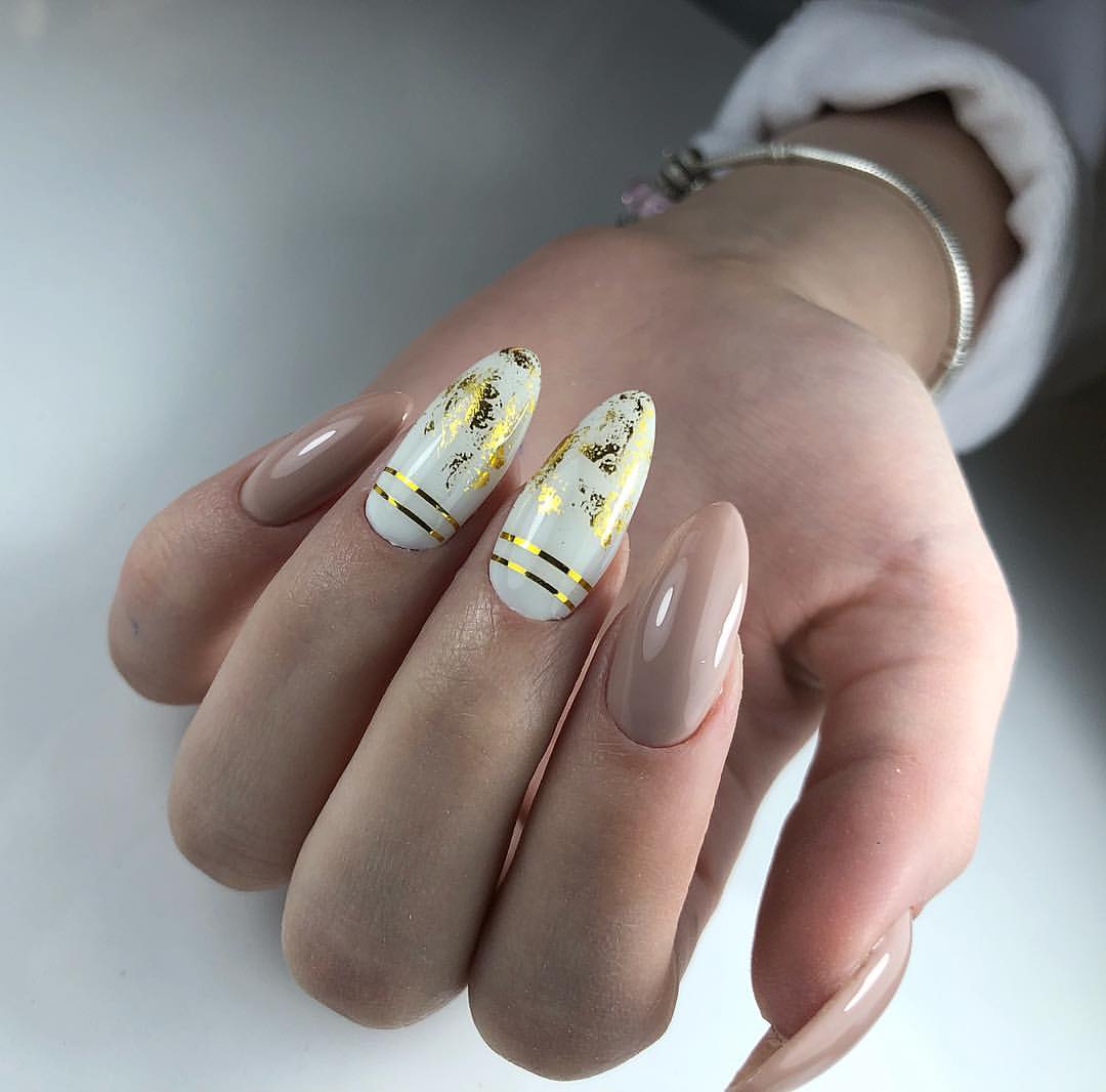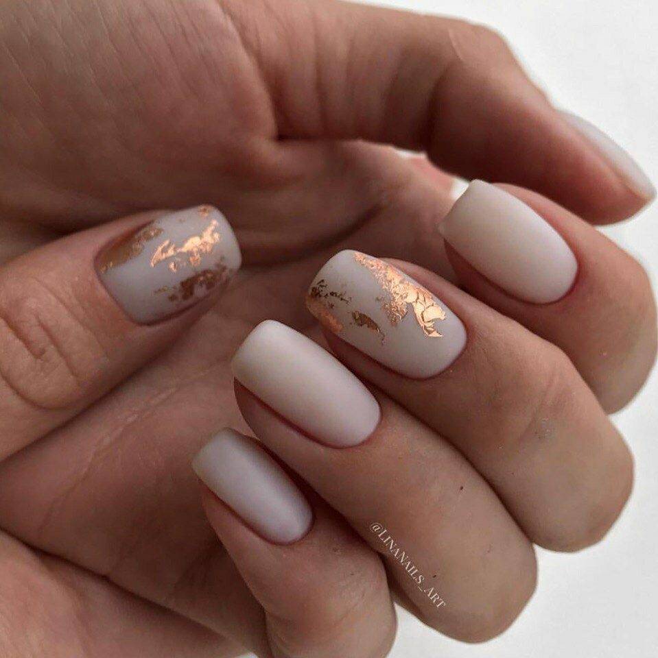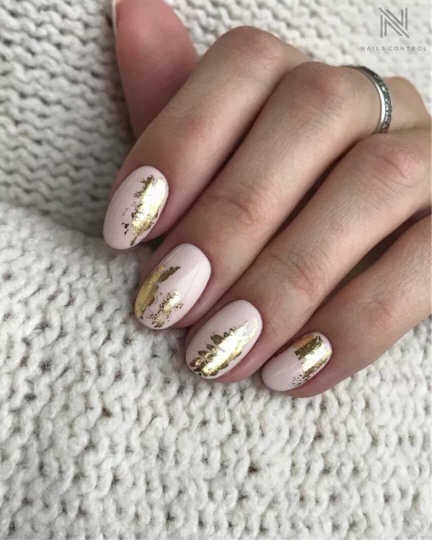 Оттиск фольгой – отличное решение для делового и повседневного маникюра. При этом на молочном фоне можно использовать не только серебряную, но и золотую или радужную фольгу.