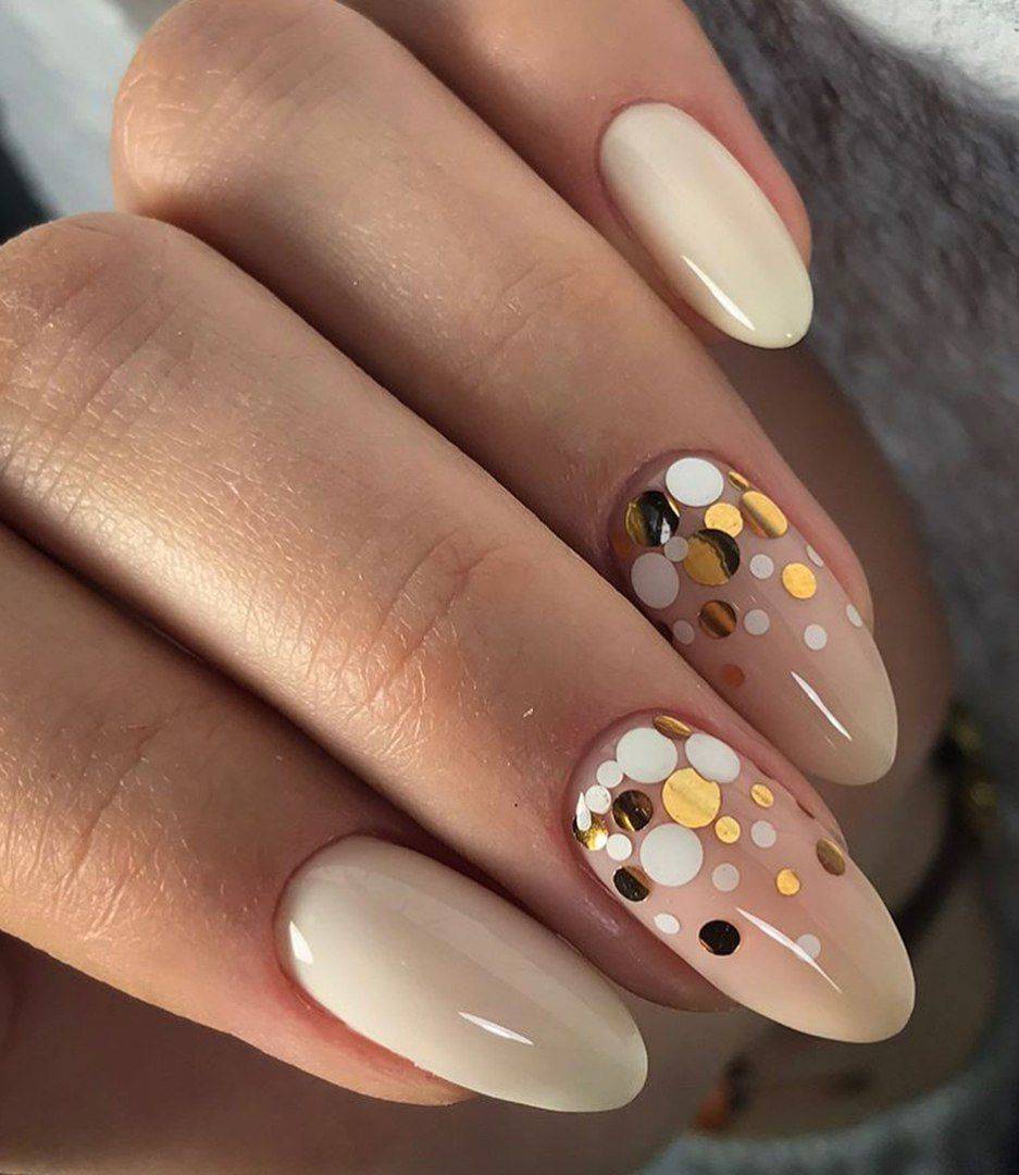 Наверное, больше всего различные блестки и глиттер ассоциируются с Новым годом. Именно в этот праздник по всюду витает атмосфера волшебства и сбываются самые смелые и долгожданные желания. Поэтому многие девушки делают дизайн с интенсивным декором в виде крупных блесток. Причем они могут быть как светлые, нейтральные, так и очень яркие, насыщенные. Все зависит от ваших личных предпочтений. Смотрится это очень красиво, особенно в сочетании с монохромным образом. За счет этого ноготки выступают в роли яркого акцента.