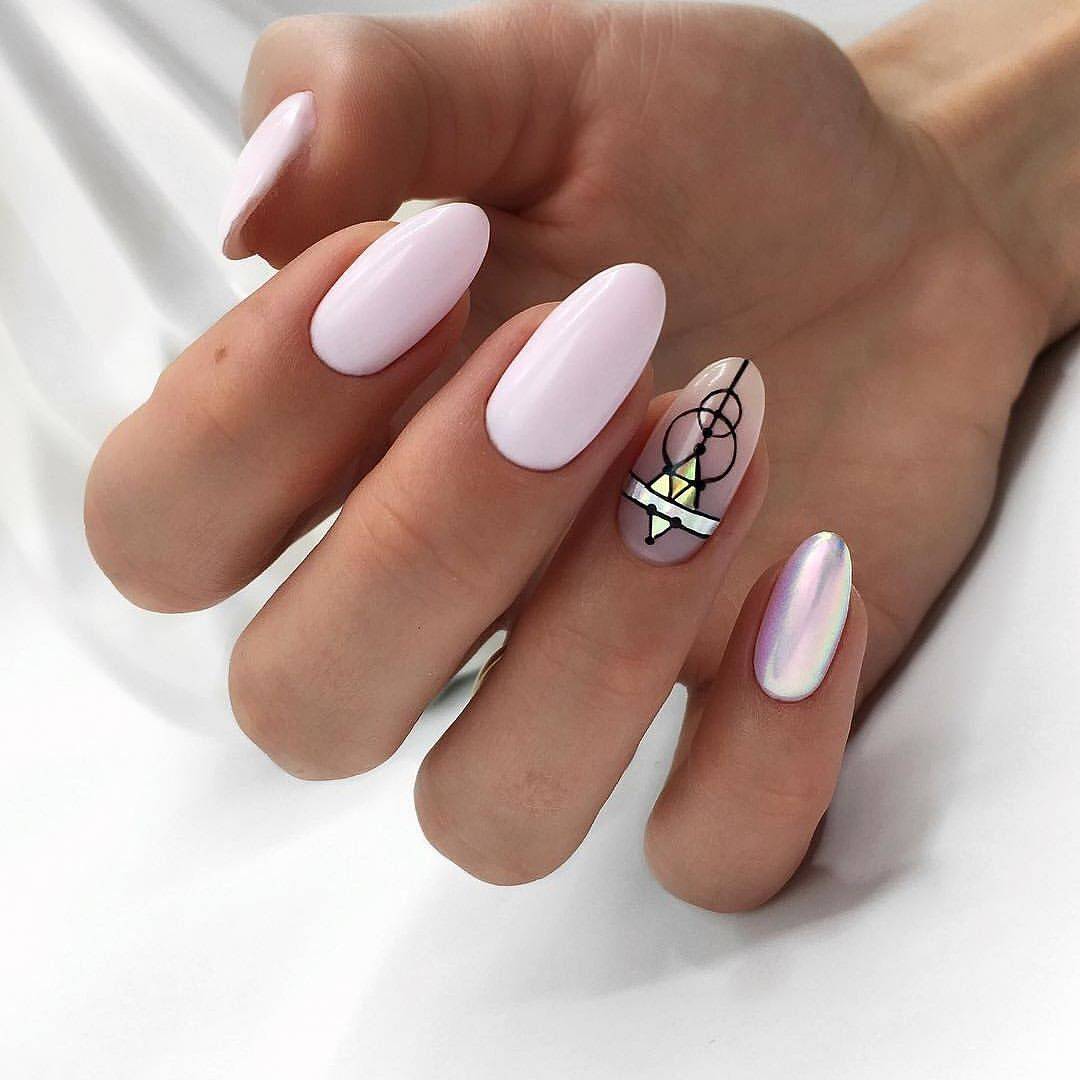 Различные геометрические рисунки на ноготках все также не теряют свою актуальность и в этом году. Четкие линии, различные фигуры, зигзаги и другие варианты – отличное решение для тех, кто любит минимализм в дизайне ногтей. Но все же такой дизайн все чаще комбинируют с цветным покрытием. Смотрится это не менее привлекательно. Также многие нейл-мастера предлагают дополнять геометрический дизайн блестками. Безусловно, такое сочетание весьма необычное. Однако модницы быстро оценили такой подход в оформлении маникюра.