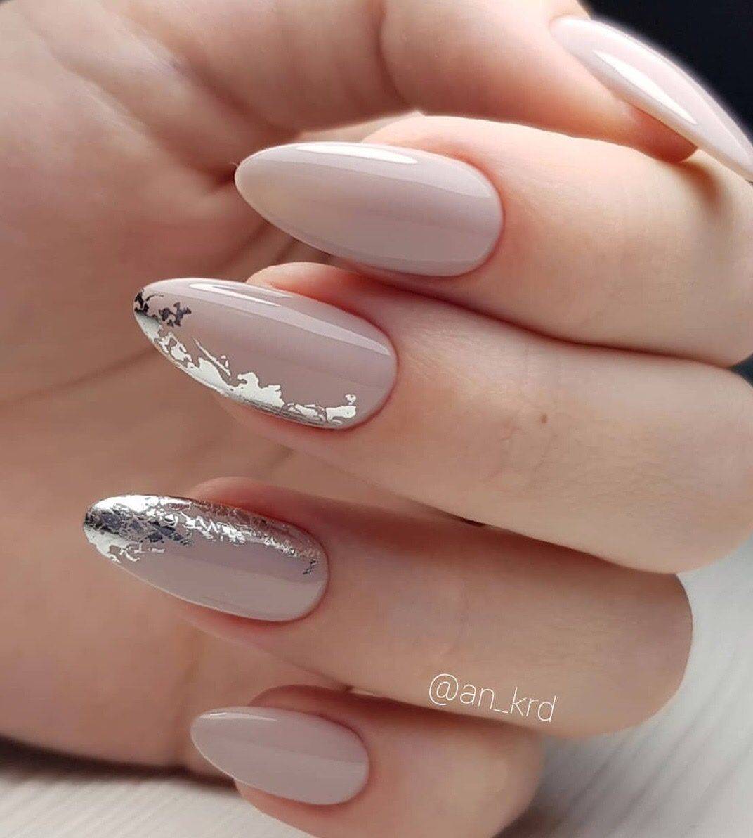 Выполнить маникюр с фольгой можно как на глянцевом, так и на матовом фоне. На любом покрытии оттиск фольгой будет смотреться сдержанно и стильно. При желании дополните маникюр серебряным глиттером на одном из пальцев, например, на мизинце.