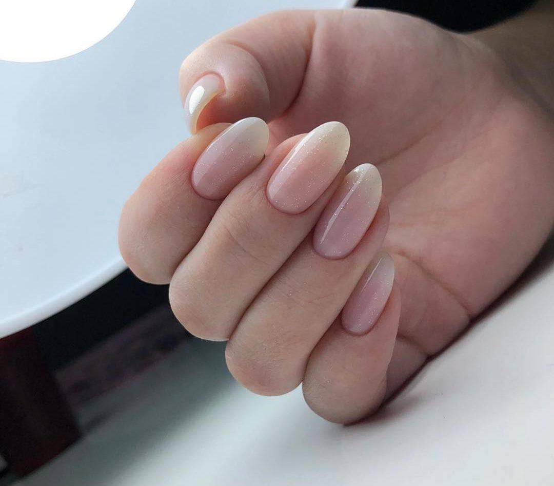 - Чтобы сделать переходы от кончиков ногтей до основания или наоборот, глиттер наносят в несколько слоев (от основания до свободного края).