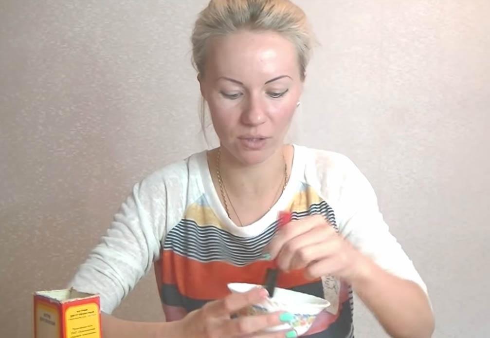 Соедините все сухие ингредиенты и разбавьте их водой. Желательно чтобы она была чуть теплой. Перемешайте и приступайте к использованию. Смесью обработайте поверхность и держите 15 минут. Смывайте слегка прохладной водой. Если ощущается сильный дискомфорт — удалите маску с поверхности раньше указанного срока.
