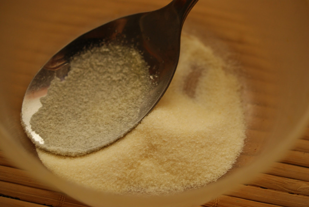 - Заливаем желатиновый порошок водой (дистиллированной или кипяченой) комнатной температуры. На 1 ст.л. желатина берем 75-85 мл воды (это примерно 5-6 ст.л.). Размешиваем и оставляем на 10-15 минут для набухания.