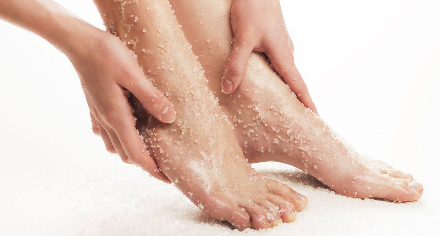 - Небольшое количество скраба распредели по ступне и массируй кожу частичками 3-5 минут, после чего ополосни ноги;