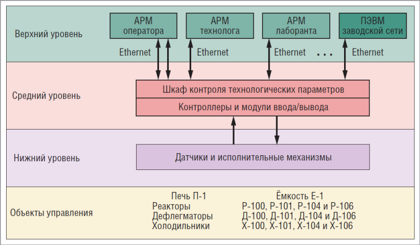 АСУ ТП представляет собой трёхуровневую распределённую систему управления.