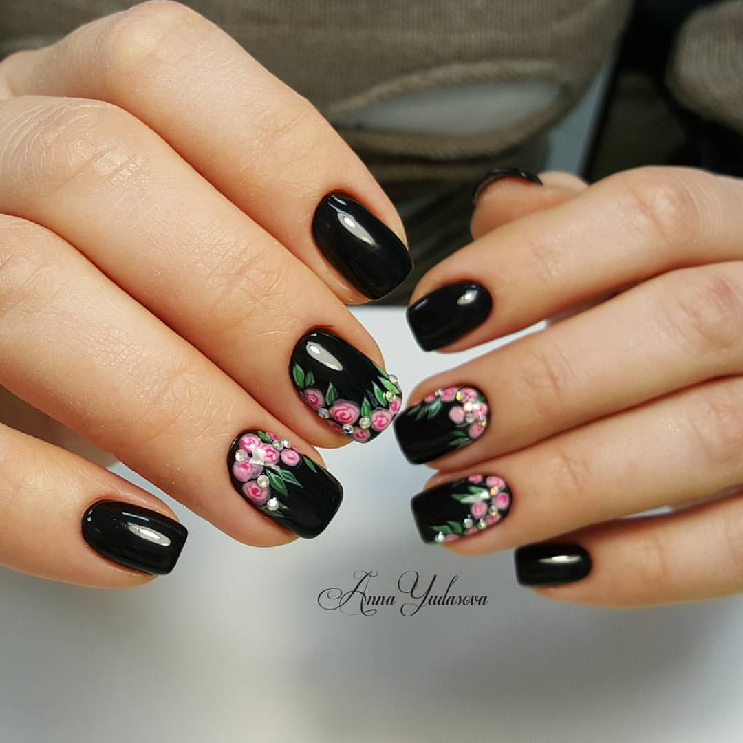 Не каждая девушка предпочитает для выполнения маникюра черный цвет, поскольку такой цвет подходит решительным и роковым дамам, которые привыкли действовать неординарными способами. Выбор такого оформления маникюра подходит как на каждый день, так и для вечеринок. Для выполнения маникюра с черным оттенком существует множество вариантов: комбинирование и смешивание с другими оттенками, а также различными росписями. Царица цветов – роза часто выполняется белым цветом, таким образом идеально подчеркивается элегантность и уверенность девушки. Для выполнения такой идеи не нужно расписывать все ноготки, достаточно одного (обычно это безымянный пальчик). Если цветочный орнамент дополнить матовым покрытием, то особая оригинальность нейл-арту обеспечена. Все зависит от желания и индивидуальности девушки.
