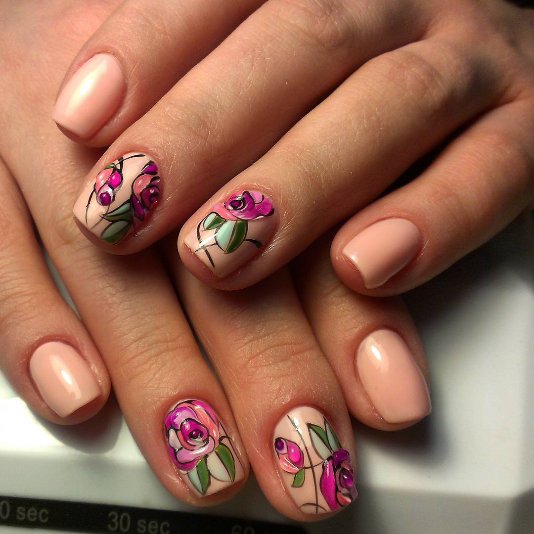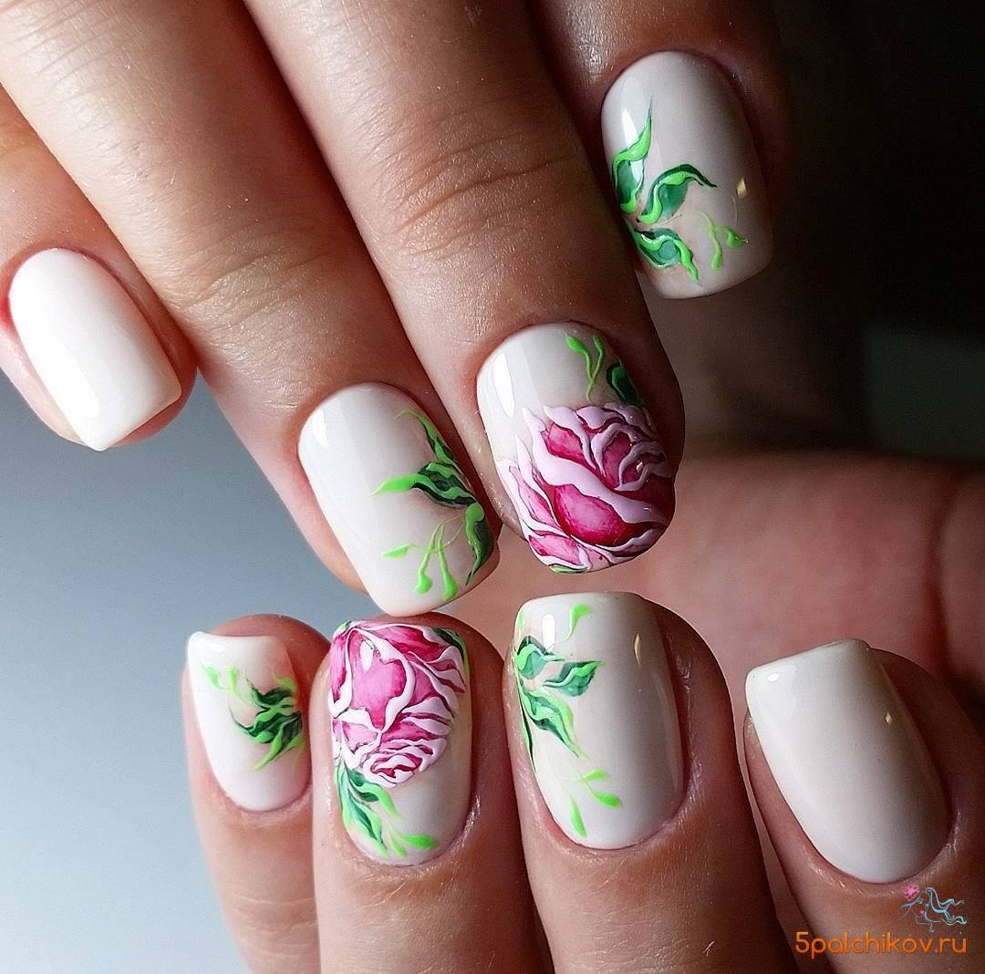 Великолепно выглядят красные распустившиеся бутоны на полупрозрачном или бежевом фоне. Если у вас короткие ногти, отдавайте предпочтение рисункам поменьше. Крупные розы выглядят вульгарно, а слишком мелкие будут сливаться в единую композицию в розовом цвете.
