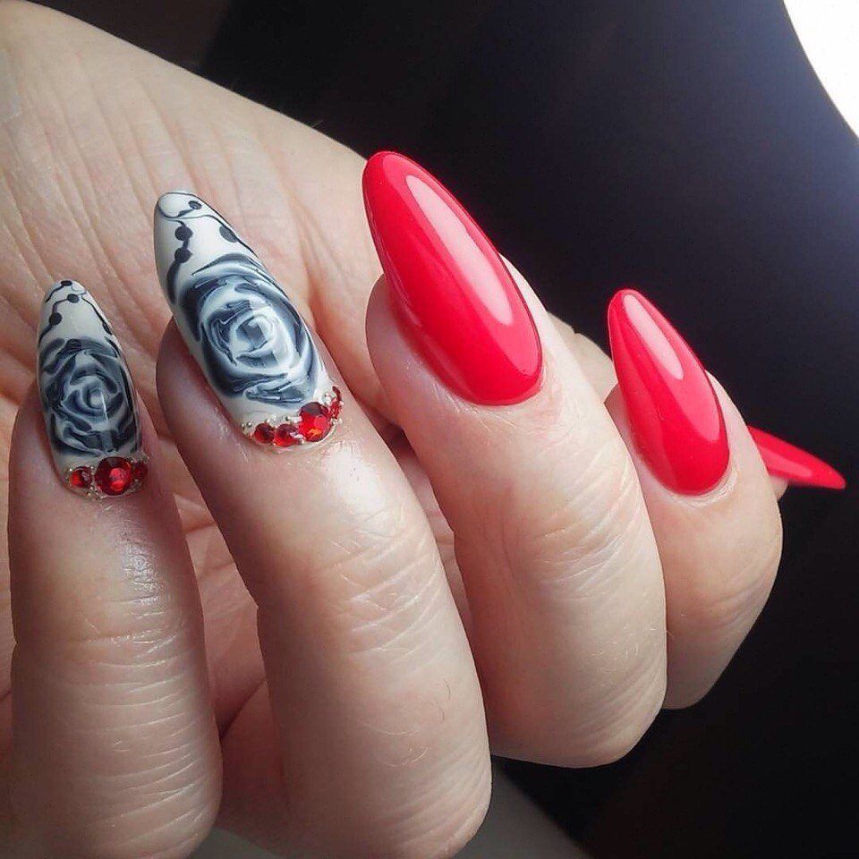 Белое покрытие ногтей с красными цветами представляют собой тандем невинности и страсти. Оно как нельзя лучше подчеркивает элегантность женских ручек. Самым востребованным дизайном является белый френч с красными маками или розами. Мастера по-разному размещают рисунки на пластинах: в зоне улыбки ноготков или полностью заполняя цветами один или два ноготка. Вечерний маникюр декорируют блестками, стразами, серебряной или золотой фольгой.