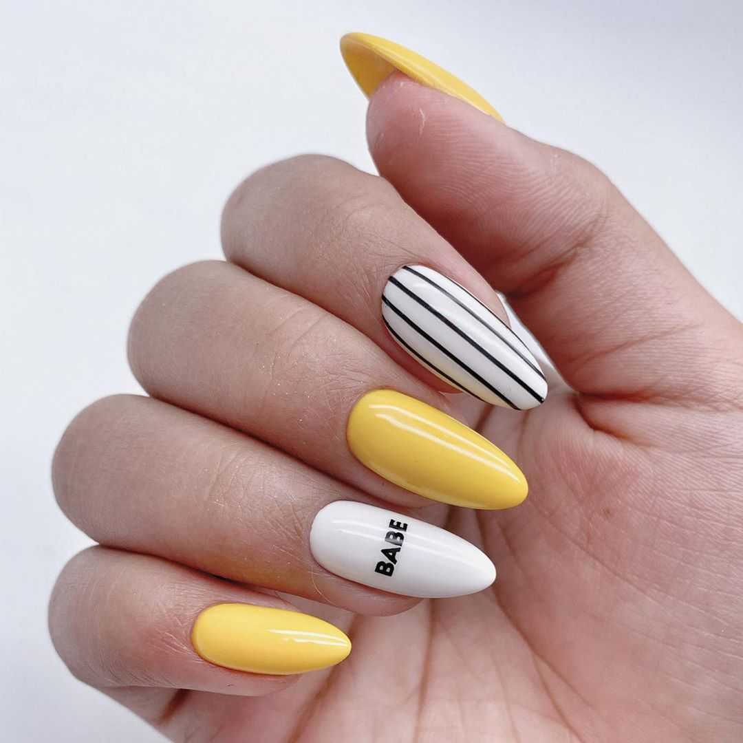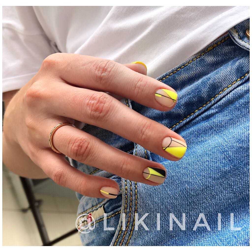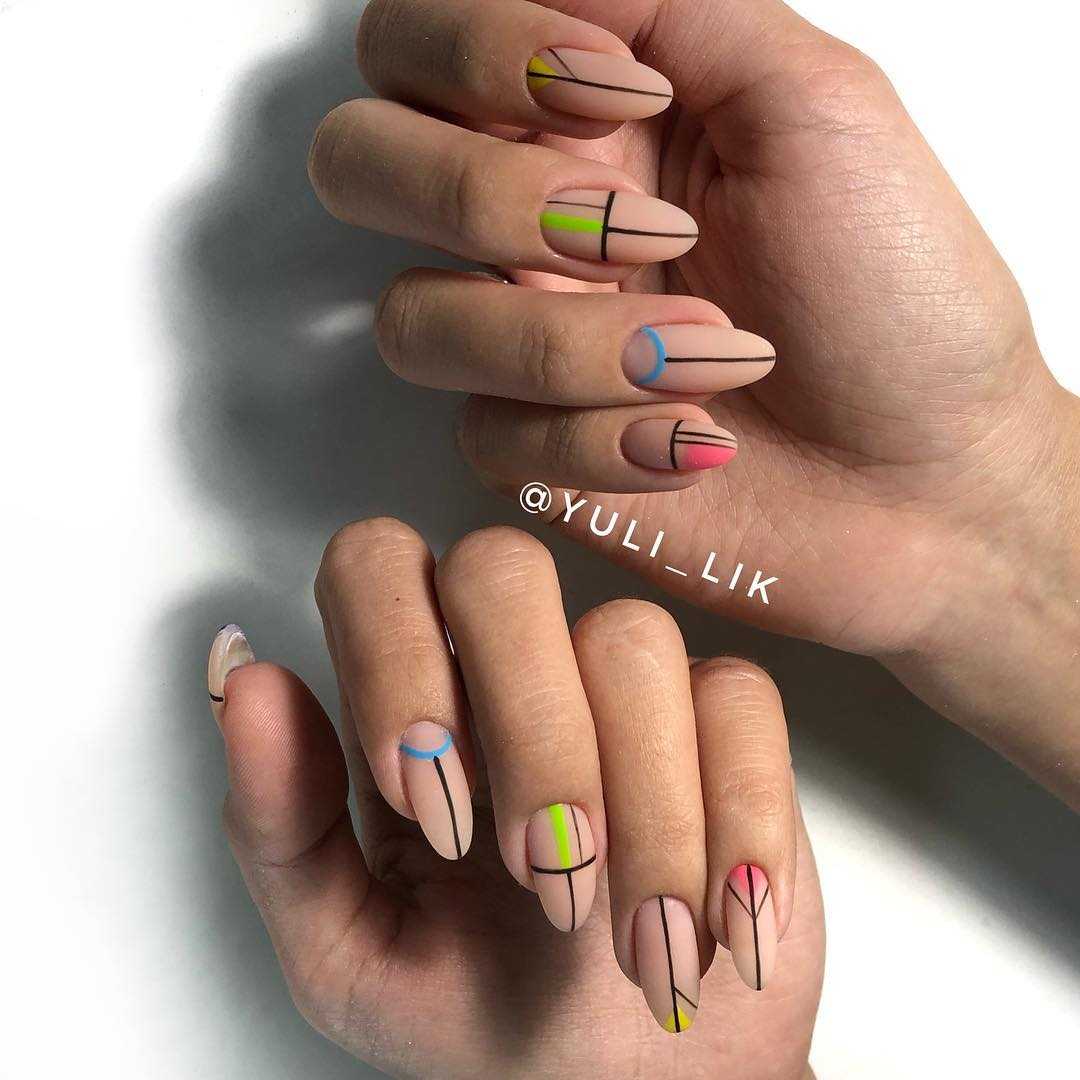 Линии или разводы в хаотичном порядке смотрятся интересно и необычно. Делается такой маникюр достаточно просто. Не нужно рисовать все ногти похожими друг на друга. Используйте линии разных цветов, толщины, направления. Предпочтение стоит отдавать ярким цветам. В качестве декора используются рисунки, наклейки или стразы.
