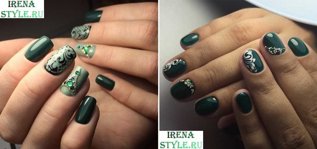 Зеленый маникюр очень подходит для новогоднего дизайна: нарисованные или наклеенные на ногтях ёлочки, игрушечные шары, звёздочки, гирлянды, снежинки смотрятся чудесно и сказочно. Горошек, клеточки, полоски, геометрические узоры, рисунок в виде фруктов (яблоки, киви, лайм), стразы, бусинки, блёстки, разноцветное кружево — экспериментировать можно до бесконечности, главное, чтобы ногти не стали одним блестящим пятном.