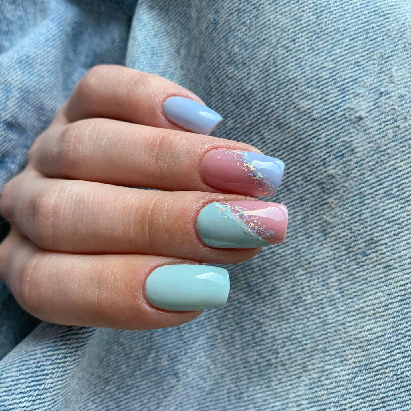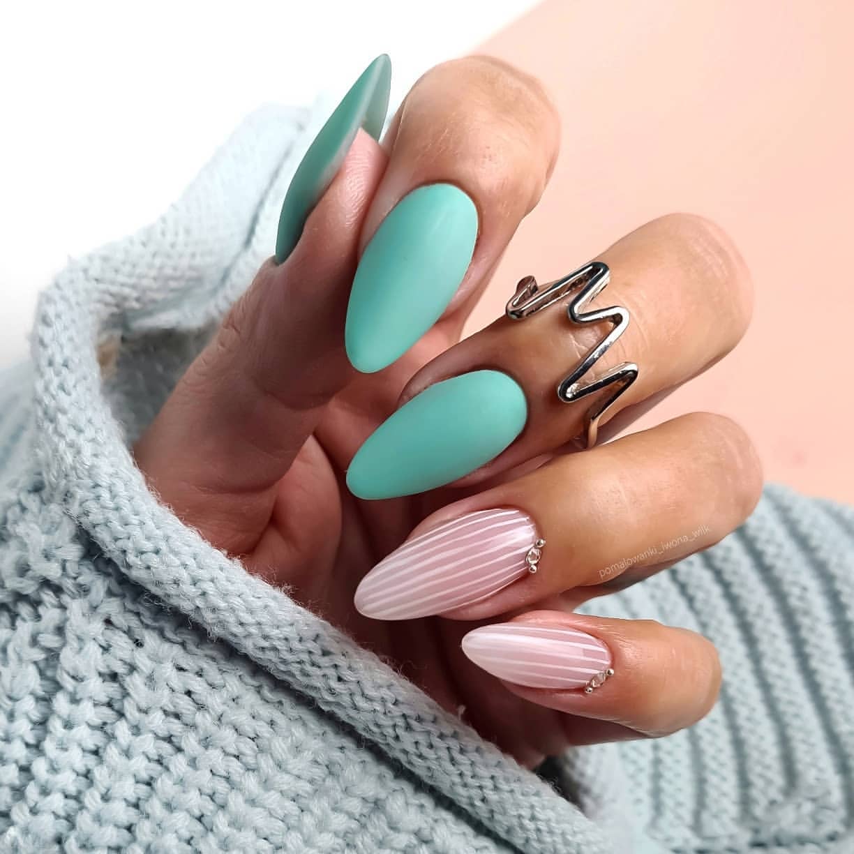 - если нет времени заниматься нанесением рисунка, то используется самый простой вариант – один ноготь покрывается лаком мятного цвета другое розового и так все десять пальцев;