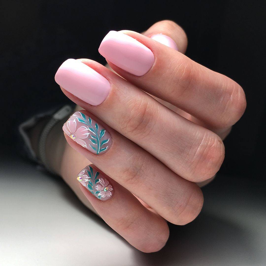 Маникюр мятного цвета с цветами в качестве акцента на безымянных пальчиках.