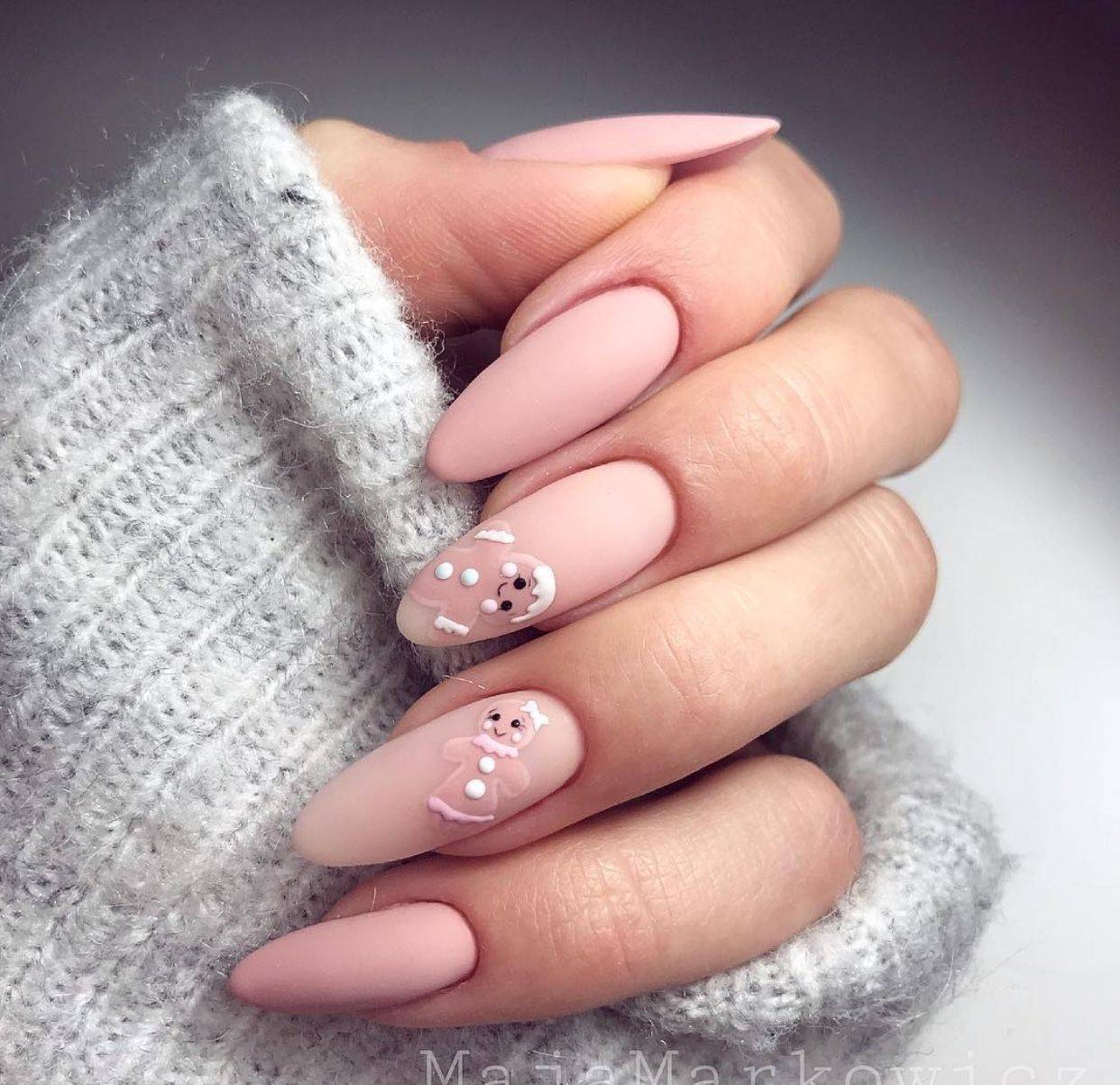 Для девушек с длинными ноготками подойдут и однотонные, и составные из нескольких цветов дизайны. Кроме того, на длинных ногтях очень стильно и модно будут выглядеть: блестящий френч, елочные шары, выложенные стразами, вязанный дизайн, различные рисунки снеговиков, оленей, дедов морозов, металлическая втирка, эффектные градиенты и растяжки из блесток.