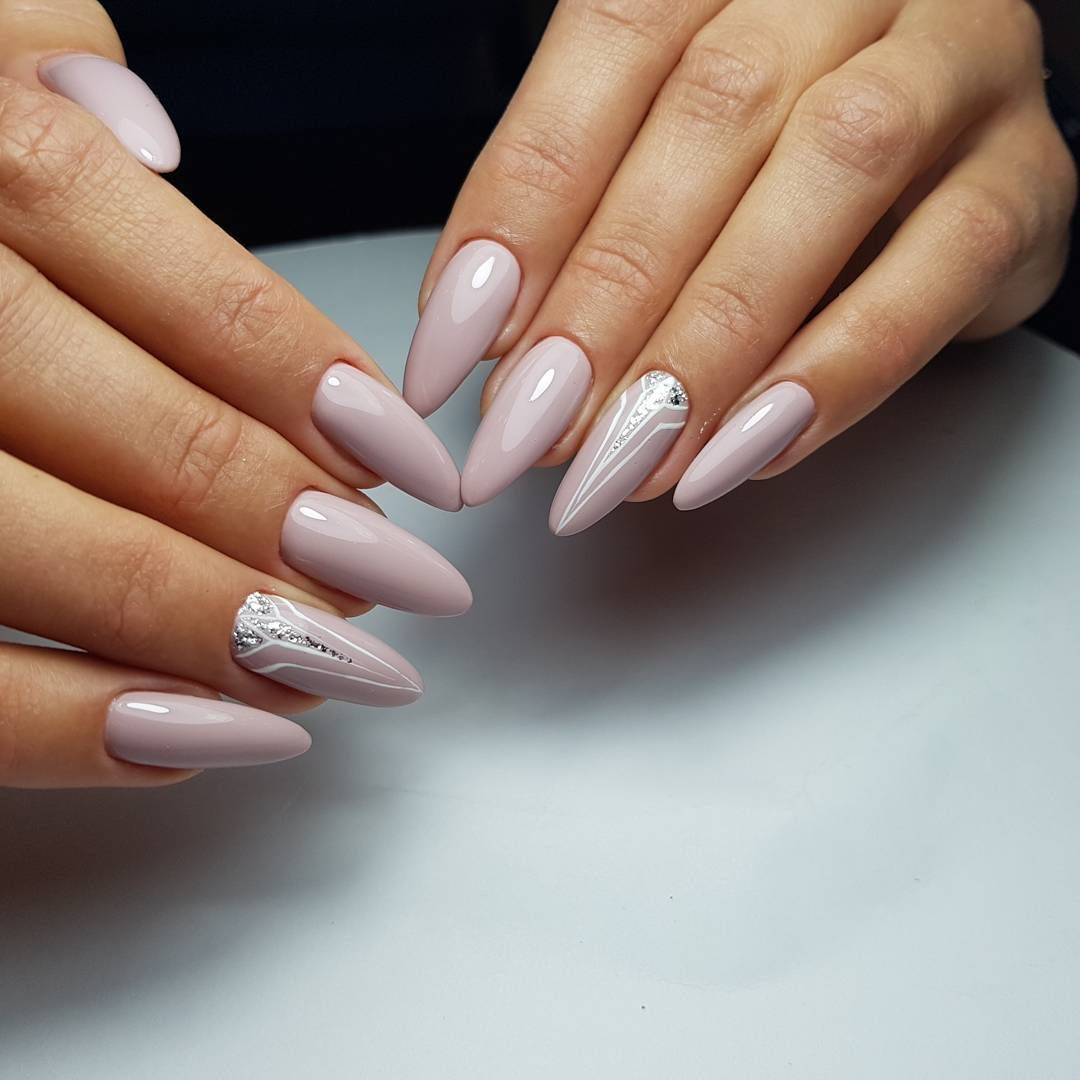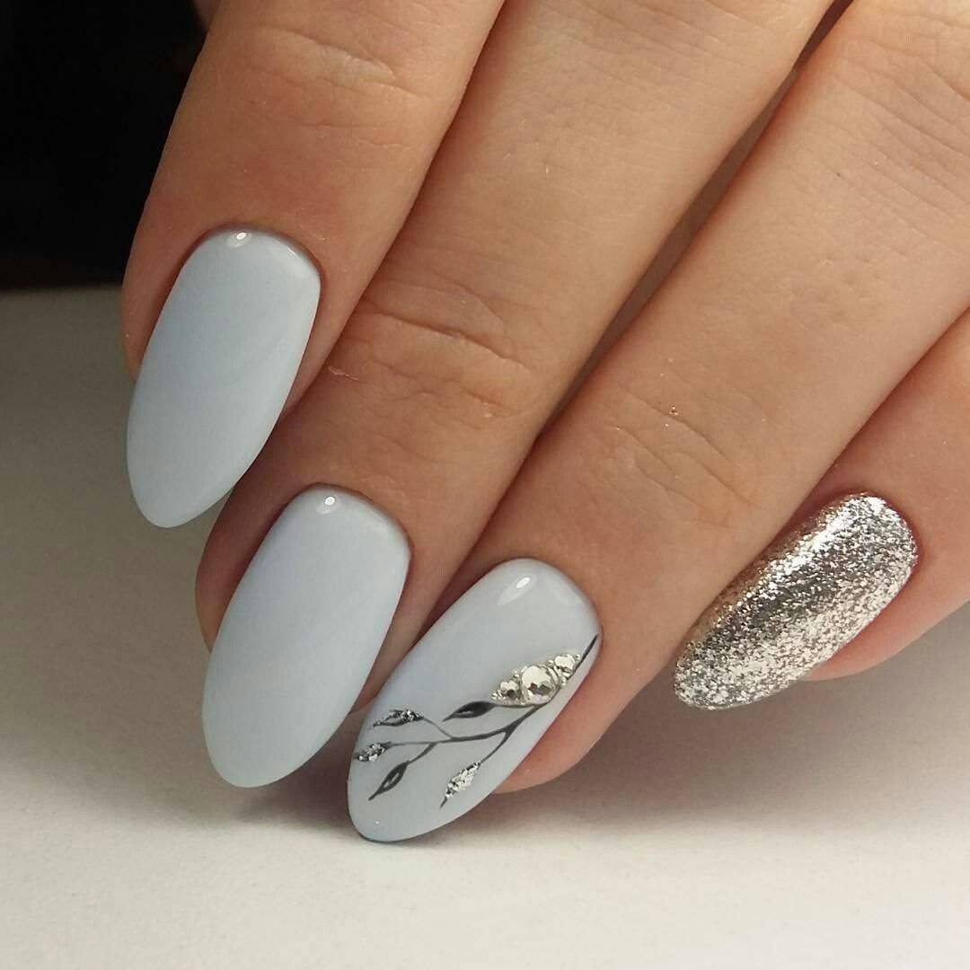 Серебряная втирка, фольга, глиттер – лучшее дополнение практически любого оттенка гель-лака. Что касается светлых тонов, то лучшим вариантом станет однотонное покрытие с поочередным окрашиванием ногтей гель-лаком и блестящим декором.