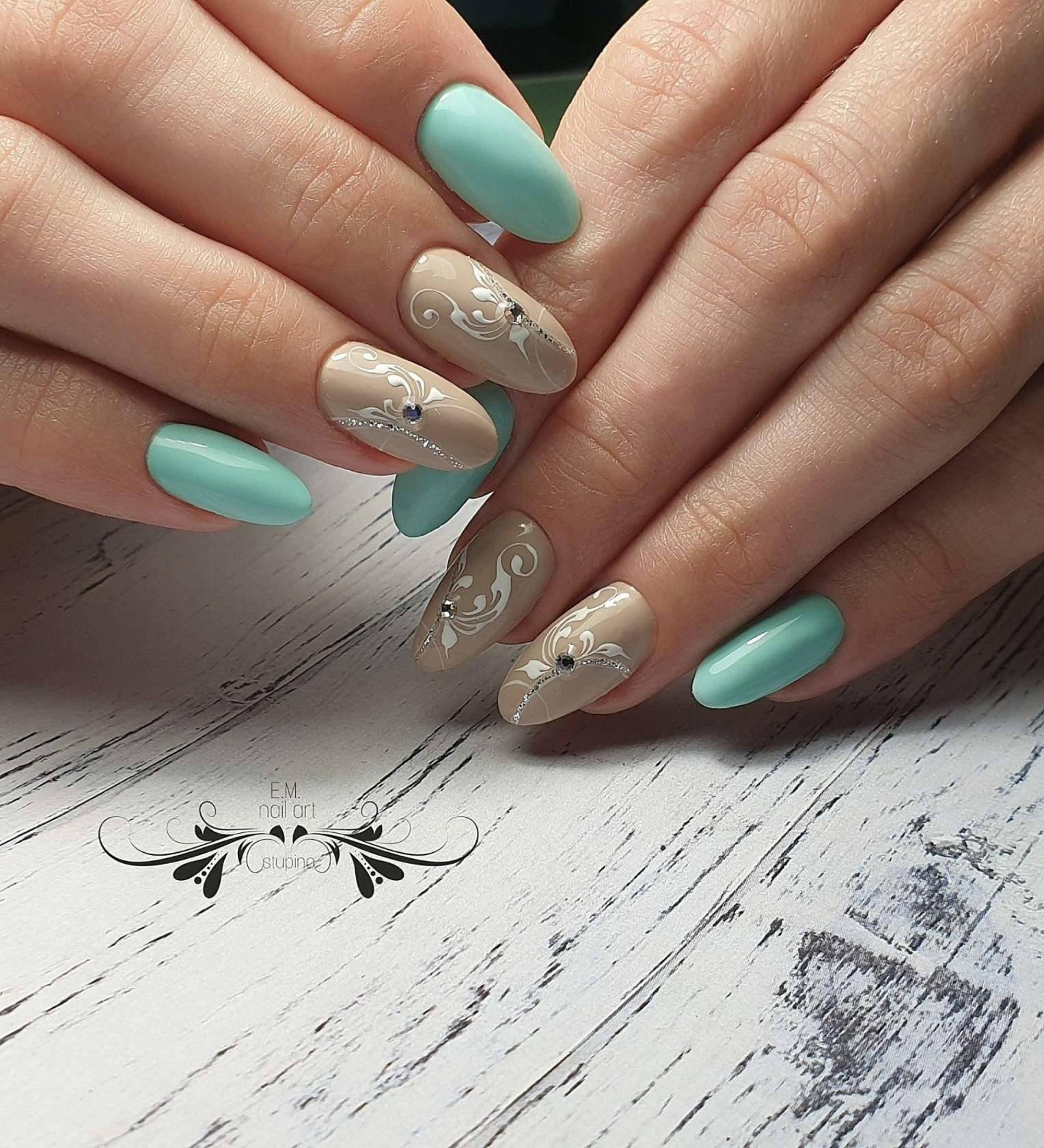 Еще один дизайн, который никогда не сможет наскучить — это дизайн с рисунком. В мятном оттенке прекрасно будут смотреться вензеля, цветы и даже фрукты. Любую задумку профессиональный мастер маникюра сможет воплотить в жизнь. Не стоит забывать и о слайдер-дизайне.