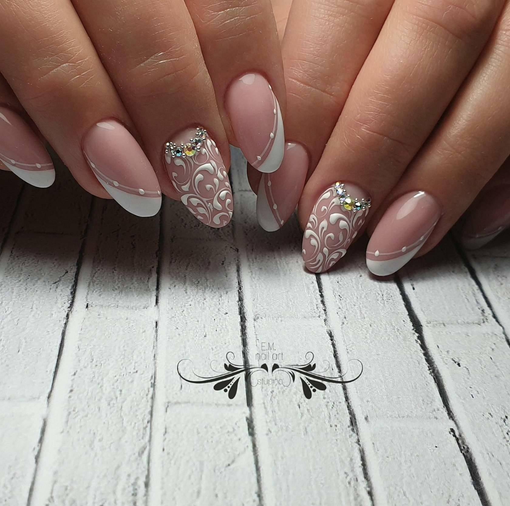 Ментоловый френч моделируют с прозрачной пластиной, покрытой обычным глянцевым топом. Дополнить французскую технику можно дотсом, разрисовав один или два пальчика точками. Ажурный рисунок отлично сочетается с камнями, гармонично подобранными по размеру.