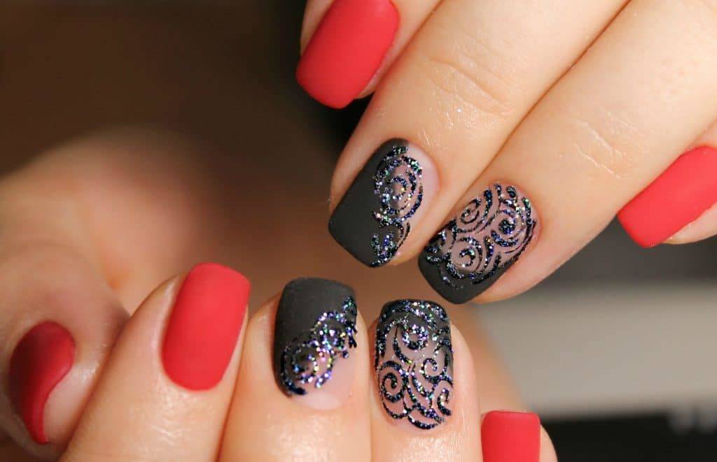 Сочетание матового с глянцевым позволяет создавать на ногтях невероятно эффектные узоры. Можно использовать трафареты или рисовать кисточкой, зубочисткой или дотсом. Особенно красиво этот вид дизайна смотрится с темными цветами лаков.