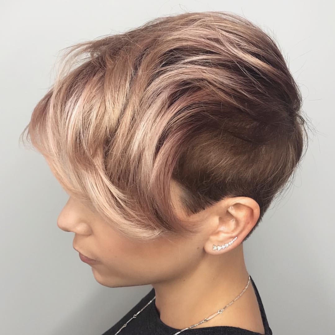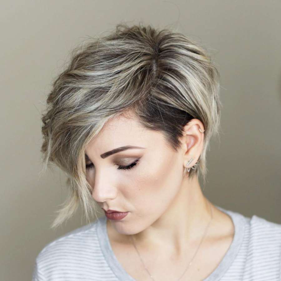 Короткая стрижка типа пикси заиграет новыми красками, если разбавить ее несколькими светлыми прядками впереди (над линией лба). Особенно привлекательно и дерзко такое решение будет выглядеть на фоне темно-русых волос, сбритого виска и объема прически в области макушки.