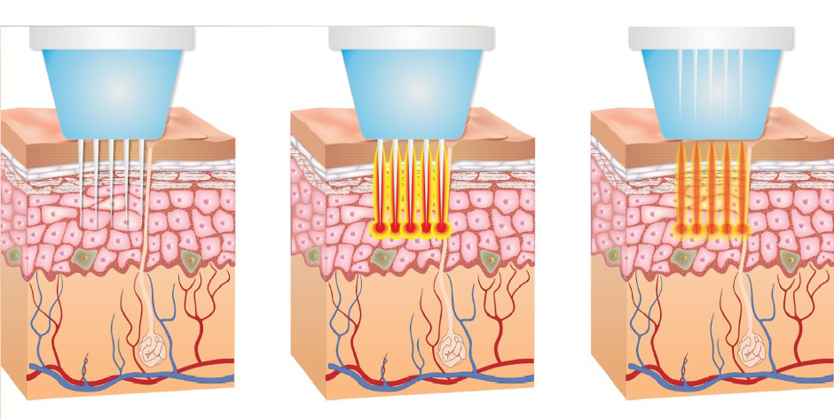 Обработка участка кожи происходит при помощи аппликатора с очень тонкими микроиглами, которые проникают в кожу и доставляют внутрь нее биполярную RF-энергию, вызывающую нагревание тканей на глубине 0,5-3,5 мм.