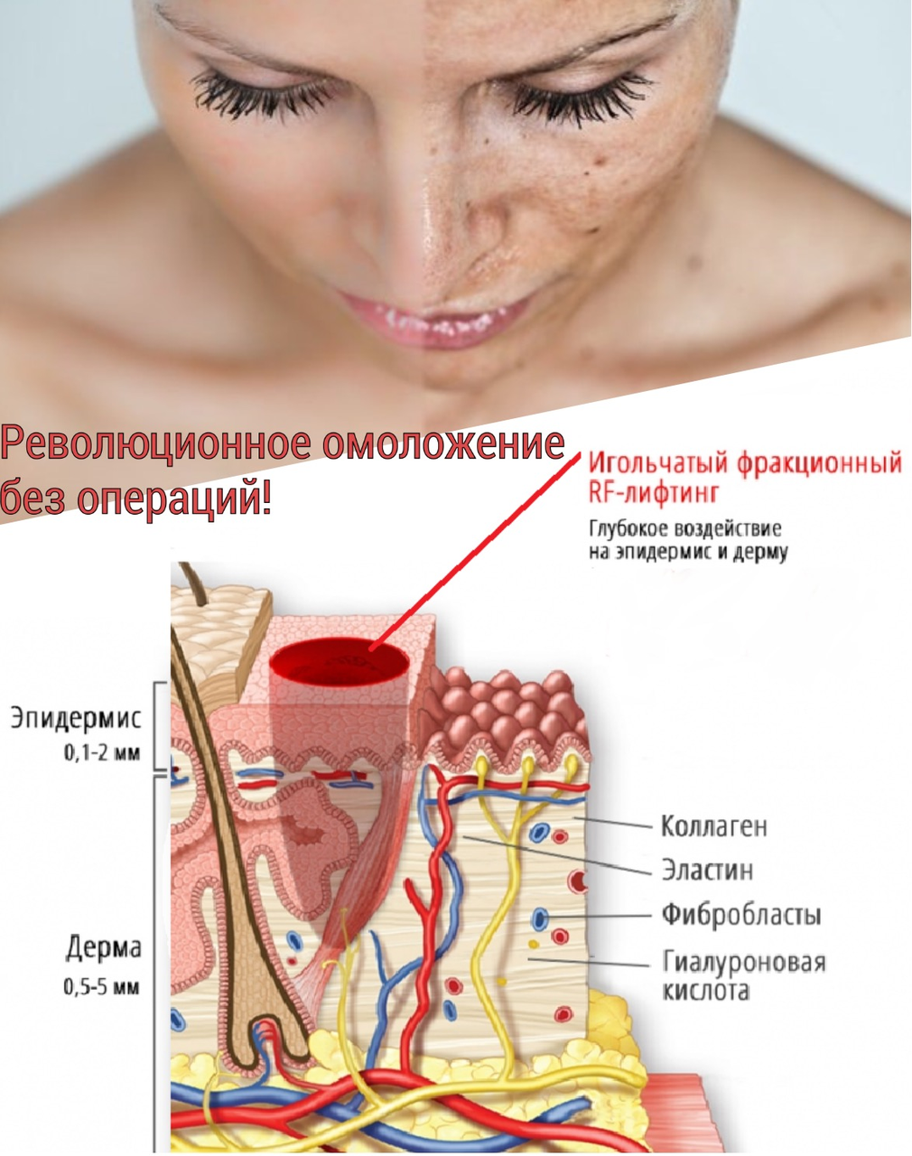 В результате теплового эффекта и нанесения контролируемой травмы активизируются регенеративные процессы, усиливается пролиферация фибробластов, принимающих непосредственное участие в процессах образования коллагена и эластина. Как следствие, происходит выравнивание микрорельефа кожи, морщины разглаживаются, рубцы становятся менее заметными.