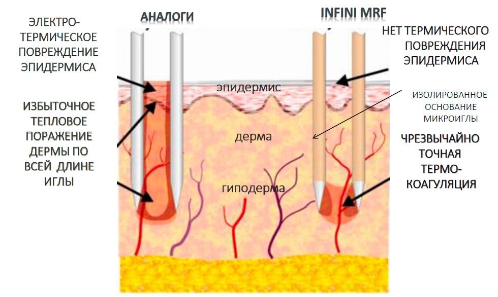 Для выполнения процедуры используется аппликатор с тончайшими микроиглами (микроэлектродами) — проводниками биполярной RF-энергии, которая через микроскопические отверстия в коже доставляется на строго контролируемую глубину (0,5-3,5 мм). Данная инновация позволяет одинаково эффективно воздействовать как на эпидермис, выравнивая микрорельеф кожи (устранение рубцов, дефектов постакне, сужение расширенных пор, регуляция деятельности сальных желез), так и на дерму, запуская выработку молодого коллагена и эластина, что вызывает трехмерное ремоделирование кожи и ее подтяжку (лифтинг).