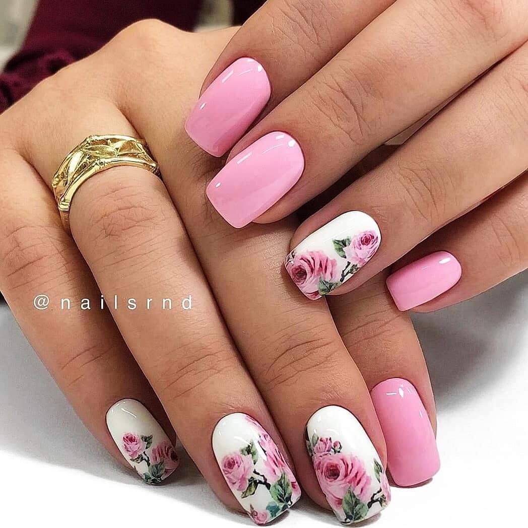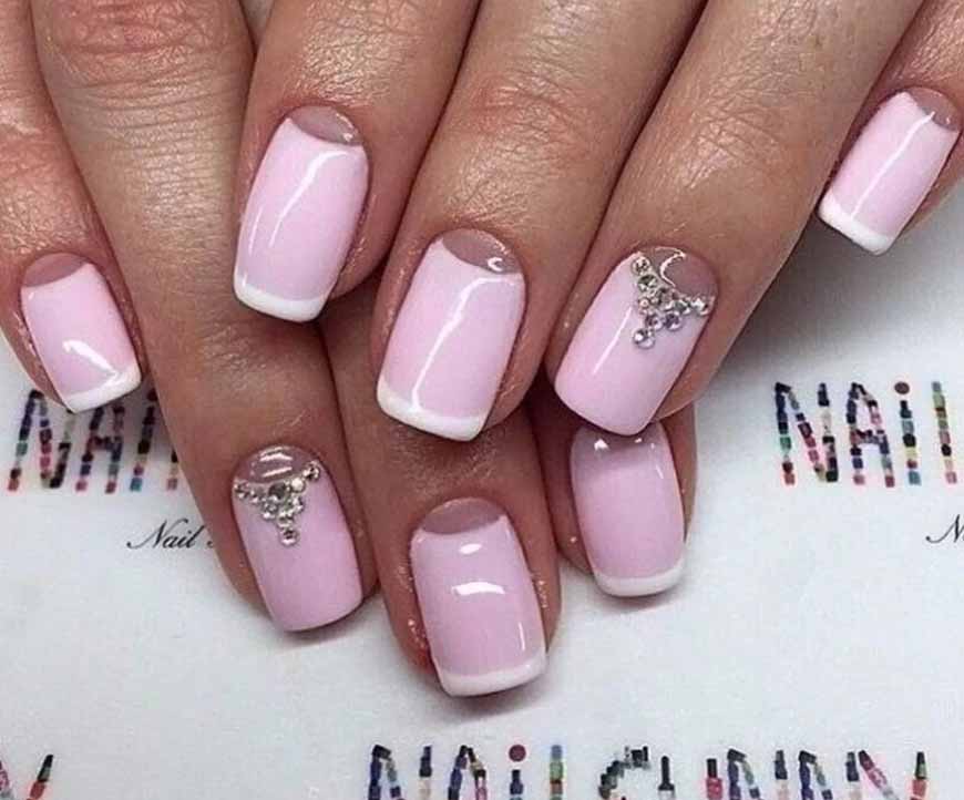 Также стоит обратить внимание на французский или лунный маникюр в розовых тонах с минимальным декором стразами. Такой маникюр выглядит просто и мило.