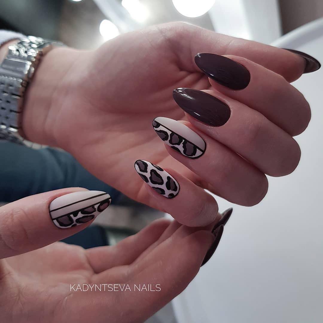 Анимализм отлично гармонирует с матовой текстурой. Используйте для дизайна темные оттенки: черный, бордовый, или напротив, светлые: кремовый, серый, коричневый и т.д. Принт анимализм должен быть главным акцентом всего маникюра, поэтому в таком нейл-арте лучше отказаться от декора стразами, бульонками или глиттером.