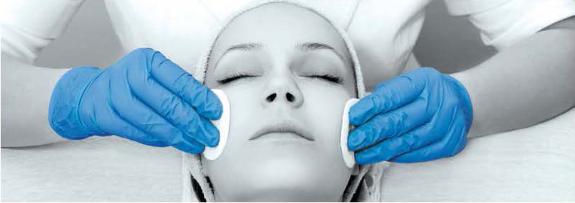 - Лицо очищается от мейк-апа, загрязнений и излишком кожного сала с помощью молочка глубокой очистки. После чего поверхность дезинфицируется.