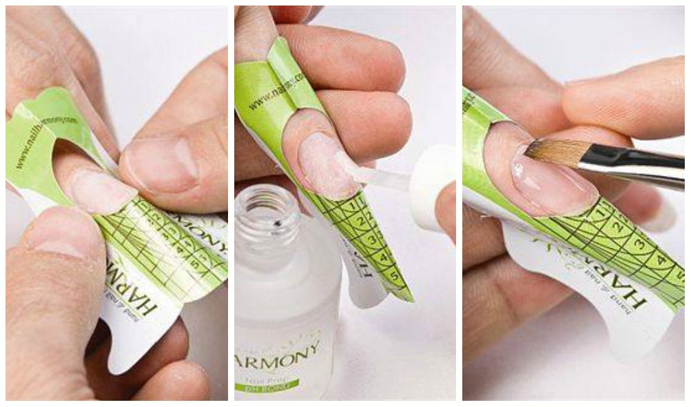 На данном этапе на каждый палец надевается бумажная типса, а пальцы сгибаются. Для создания качественного наращенного акрилового маникюра, форму следует расположить под углом ногтевых пластин. Не допускается завышение либо занижение формы. В случае неправильного расположения типсы, ногти будут трескаться и ломаться.