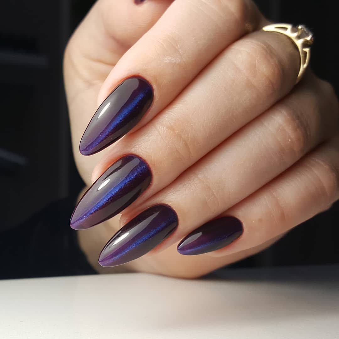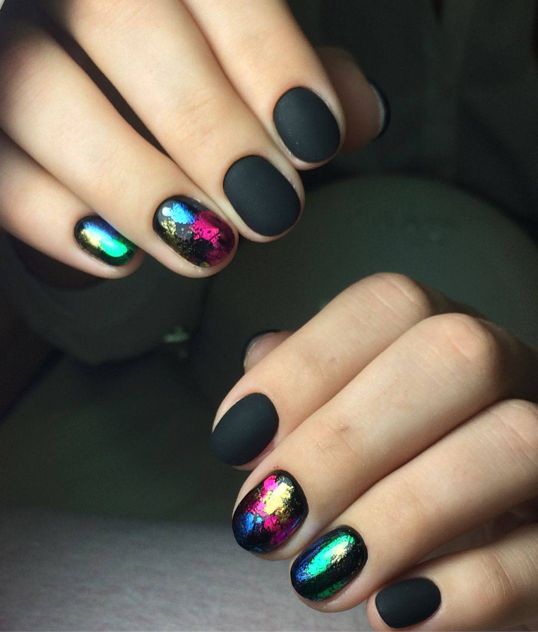 Выполните дизайн ногтей в темных оттенках, дополняя их белыми разводами с эффектом металлики — такие ногти будут смотреться дорого, очаровательно и, что не менее важно, модно. Следующий интересный эффект на ногтях можно воссоздать при помощи всего лишь одного лака с эффектом голографического сияния
