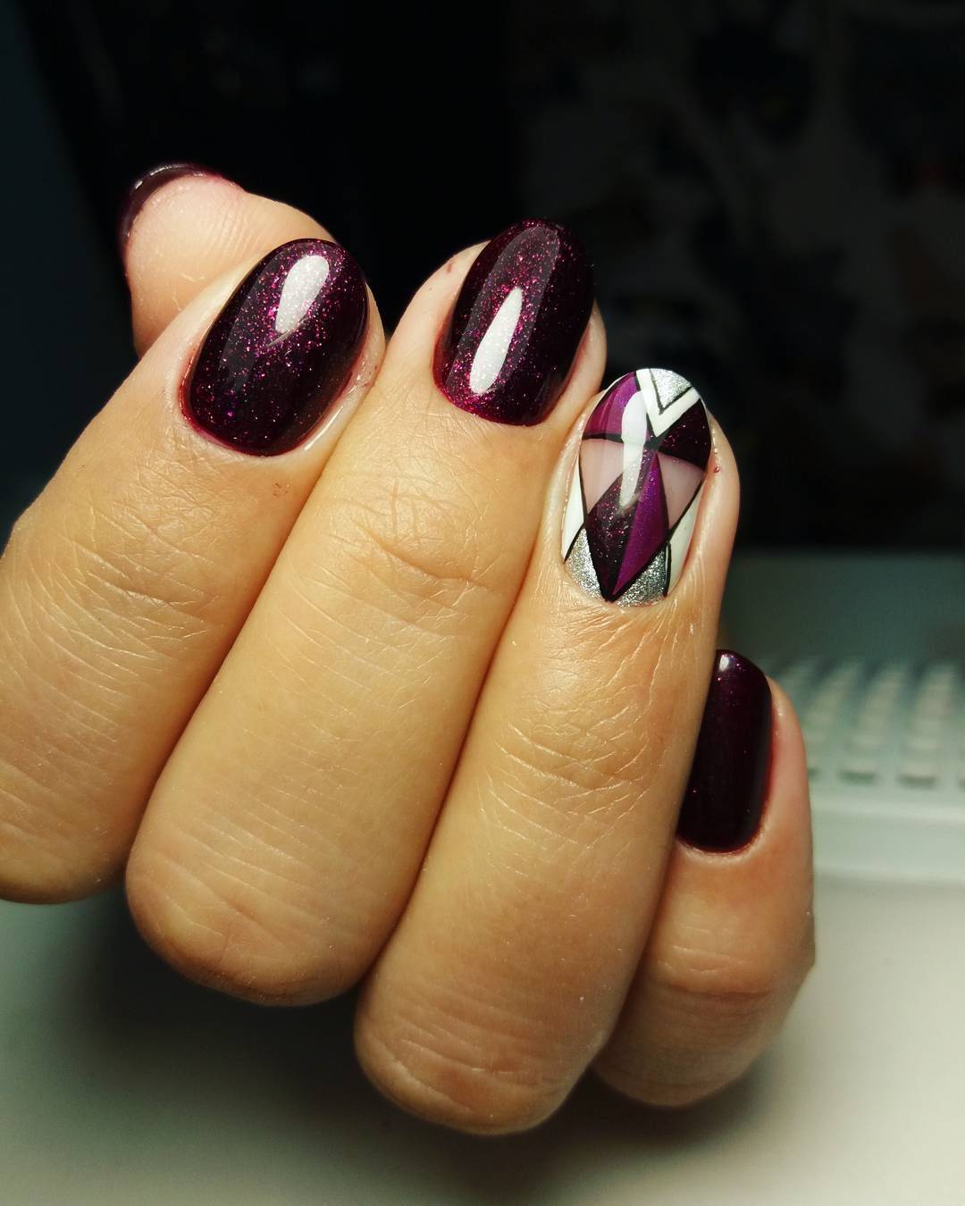 Еще одна тенденция, которую можно применить в создании зимнего маникюра – абстрактные яркие рисунки. Это может быть микс из треугольников, кругов, квадратов, линий или волн. примеры такого маникюра можно посмотреть на фото.