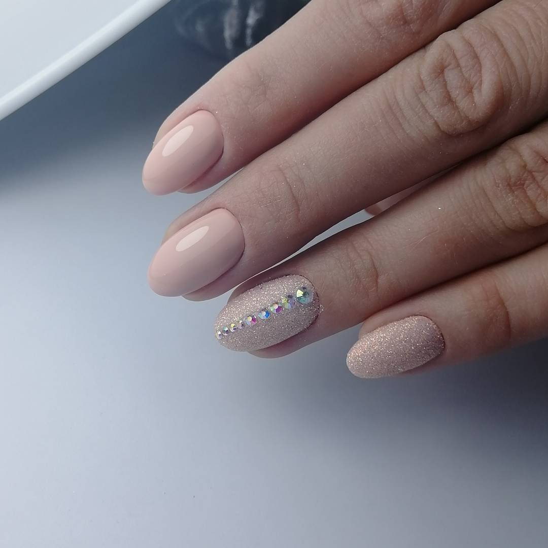 Тенденцией красивого модного маникюра 2021 можно назвать нюд в матовом исполнении с фольгированным напылением. Бесподобно смотрятся большие стразы в комбинации с блестящей лентой, которые идеально подойдут к вечернему наряду.