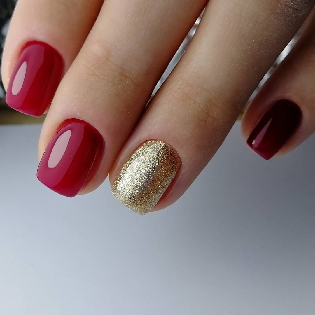 А можно ли красный сделать еще сочнее? И можно, и нужно! Для этого зимний дизайн ногтей предполагает острую ноту из золотых звезд. Это – актуально, колоритно и броско! Красный цвет завоюет лидирующие позиции: и во французском, и в лунном он сыграет свою роль.