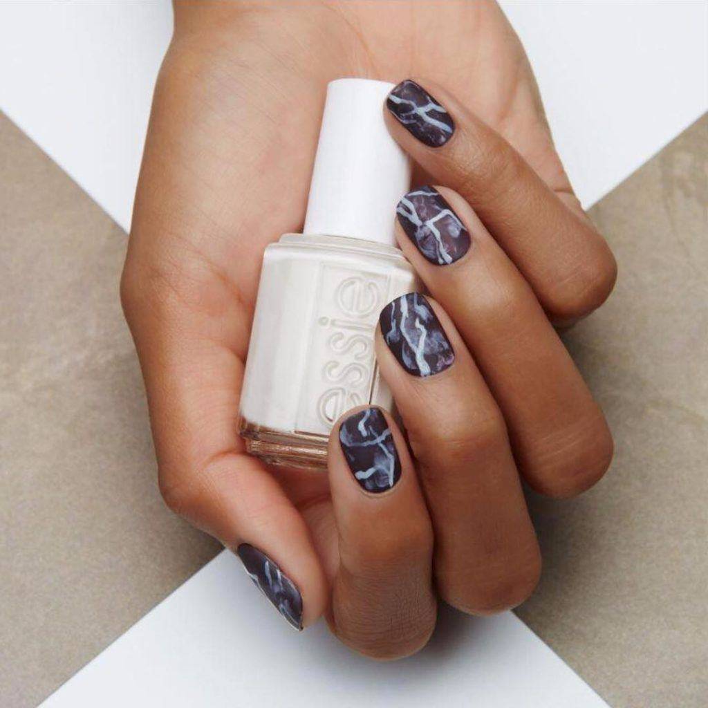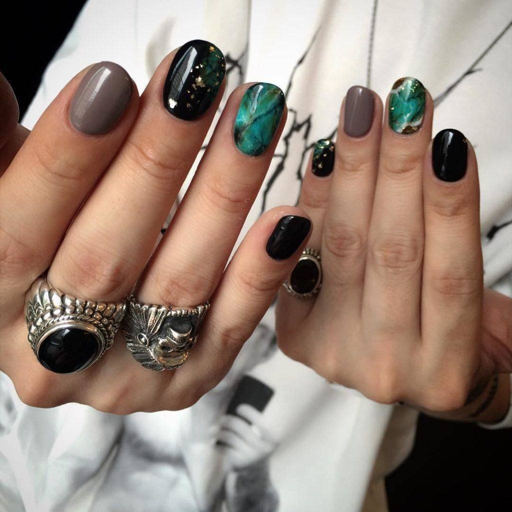 Не только спокойные нюдовые и пастельные оттенки присутствуют в модных тенденциях 2021 года. Более смелым и интересным решением являются темные варианты маникюра. В этом случае всё так же можно обратиться к идее с минеральными текстурами. Ногти, выполненные в такой технике, могут напоминать агат, нефрит, обсидиан и другие тёмные минералы