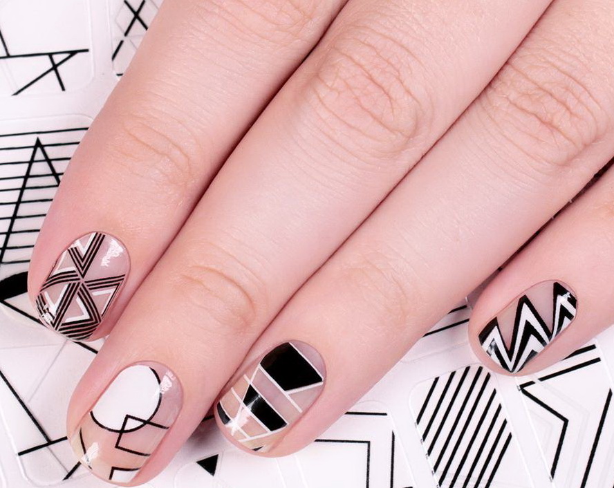 Геометрические фигуры черного и белого оттенка с добавлением глиттера будут отлично смотреться на коротких ногтях с покрытием светлого тона.