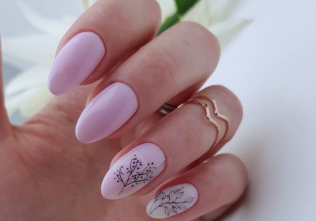 Эффектный дизайн получится, если дополнить матовое светлое покрытие тонкой веточкой черного цвета с небольшими листочками.