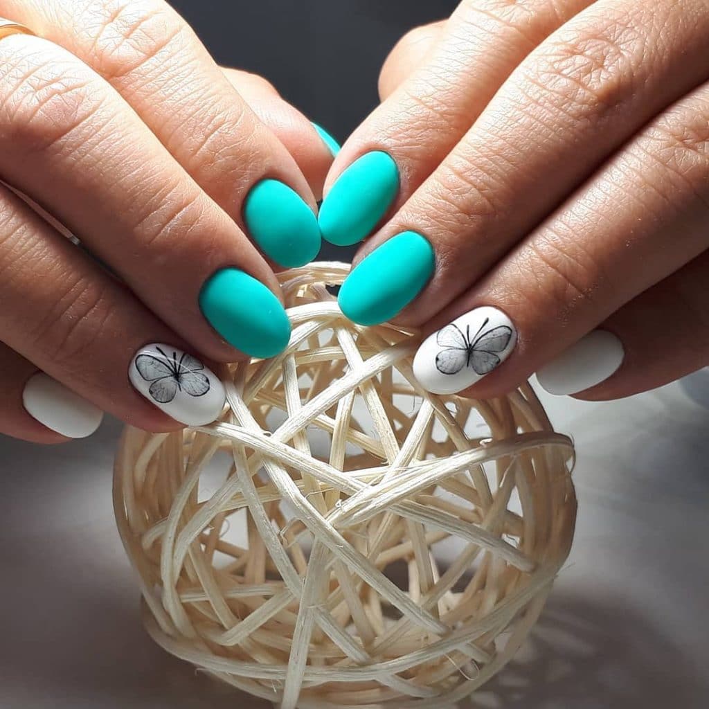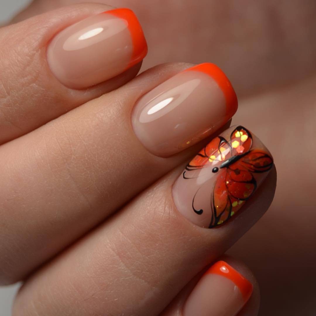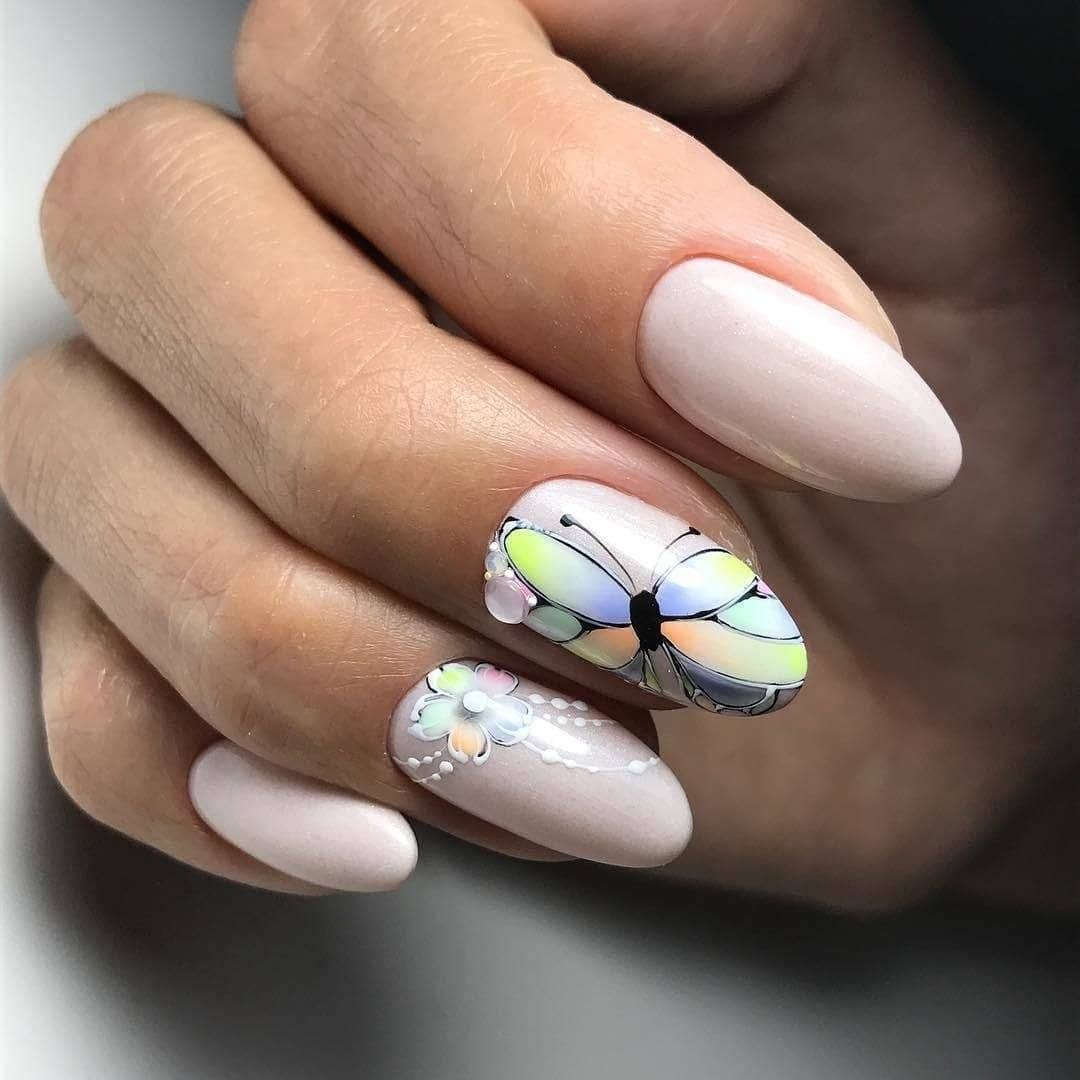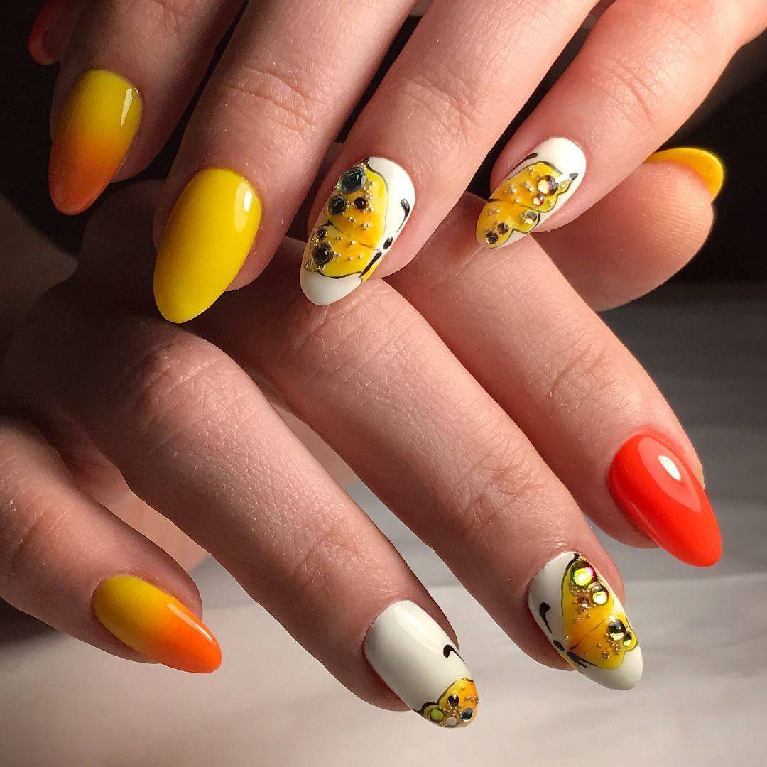 Летом девушки предпочитают выбирать оттенки в маникюре соответствующие ярким эмоциям и хорошему настроению, именно поэтому такой дизайн выглядит празднично и модно. Бабочек так же можно сделать объёмными при помощи лепки или альтернативного материала, более простого в использовании – флока. Нарисуйте крупные детализированные цветы или тонкой кистью выведите мотыльков в минималистичном стиле.