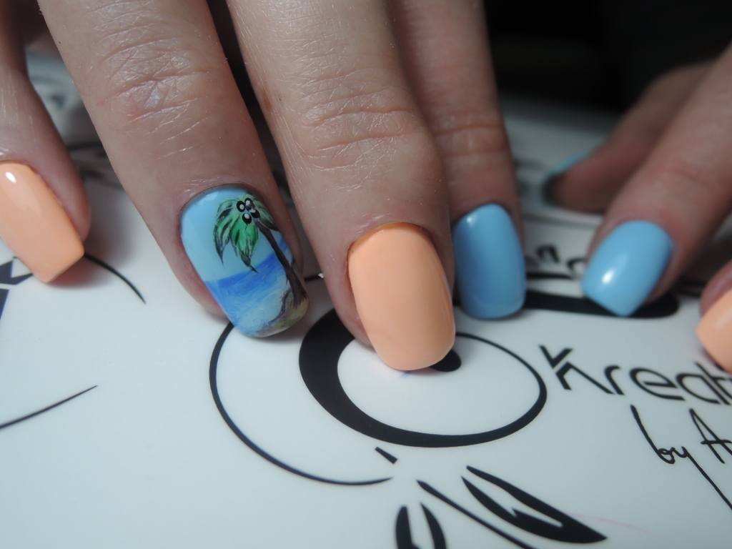 Если вы умеете рисовать, то удивите своих клиентов красивыми летними пейзажами на ногтях. Это могут быть цветы, лес, закат с черно-оранжевой цветовой гамме или морской пейзаж. Цвета в художественном маникюре берутся любые, гель-лаки могут разбавляться и смешиваться по ходу выполнения дизайна.